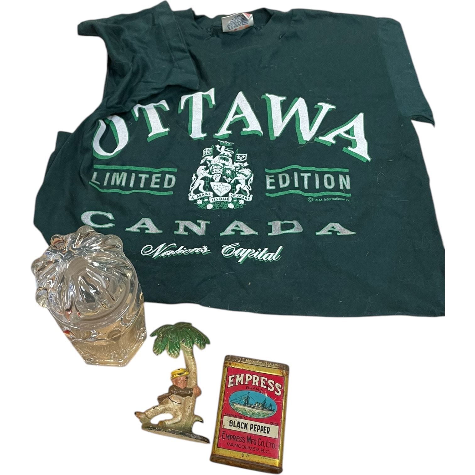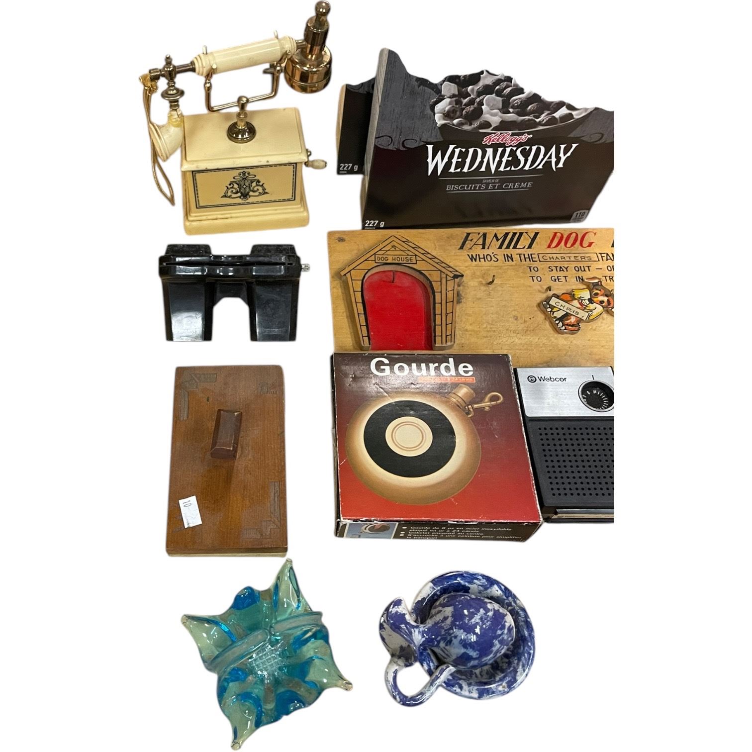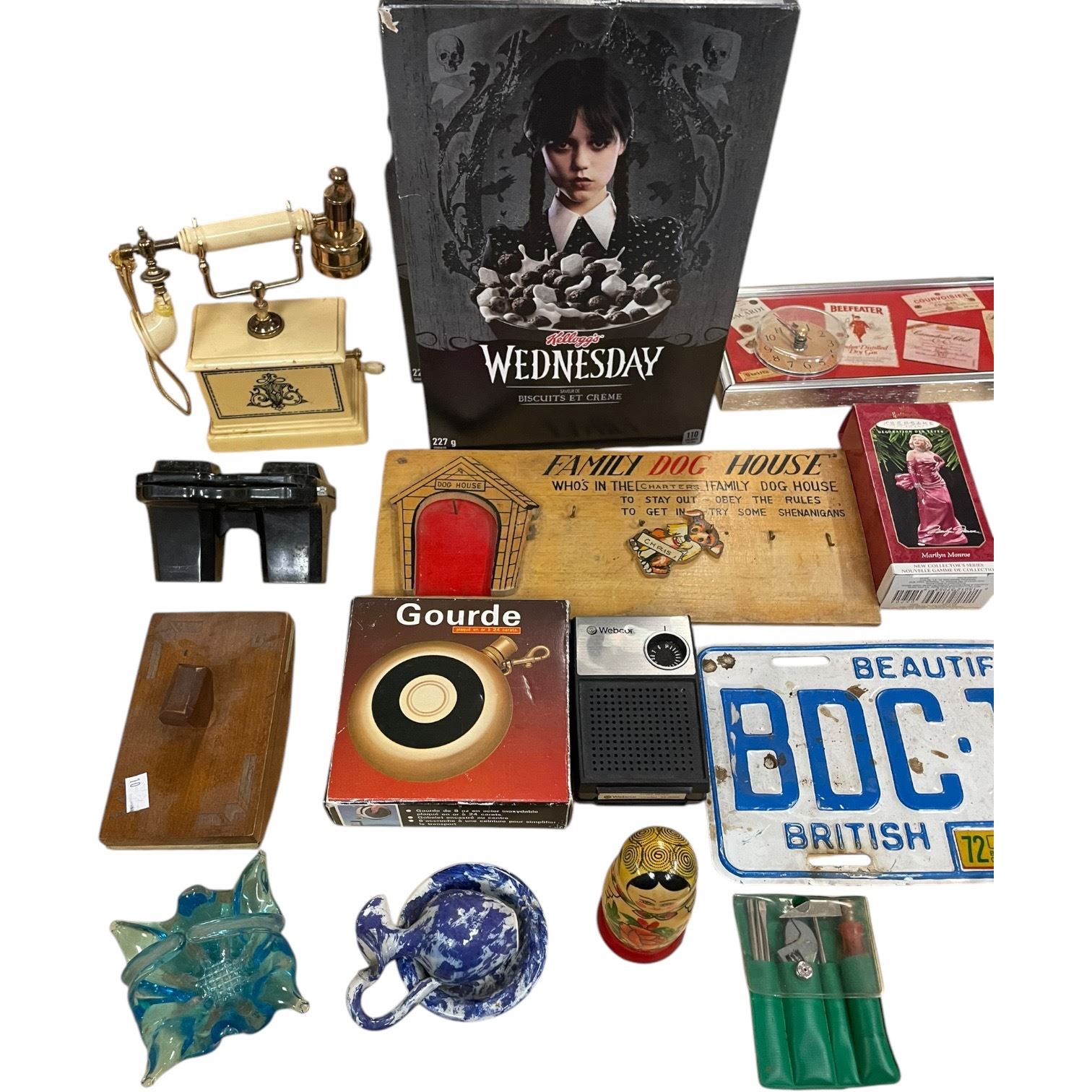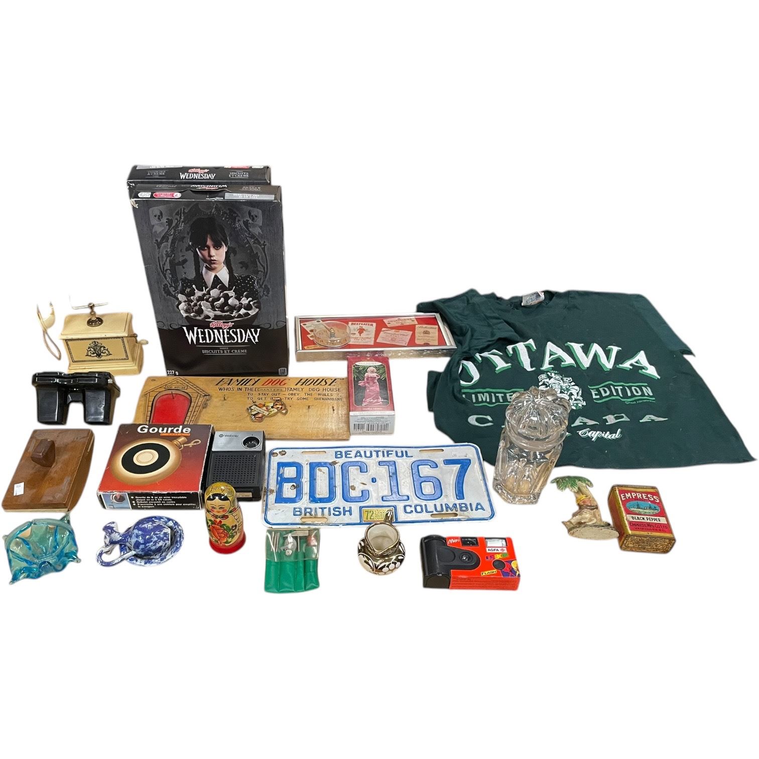 Box Full Of Assorted Collectibles, Hip Flask, License Plate, Camera, Rotary Phone Jewelry Box, Etc..