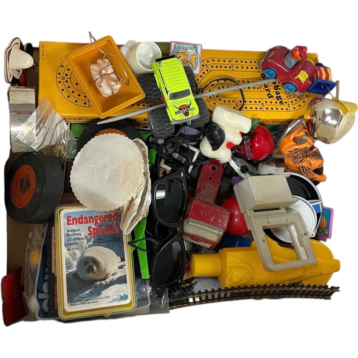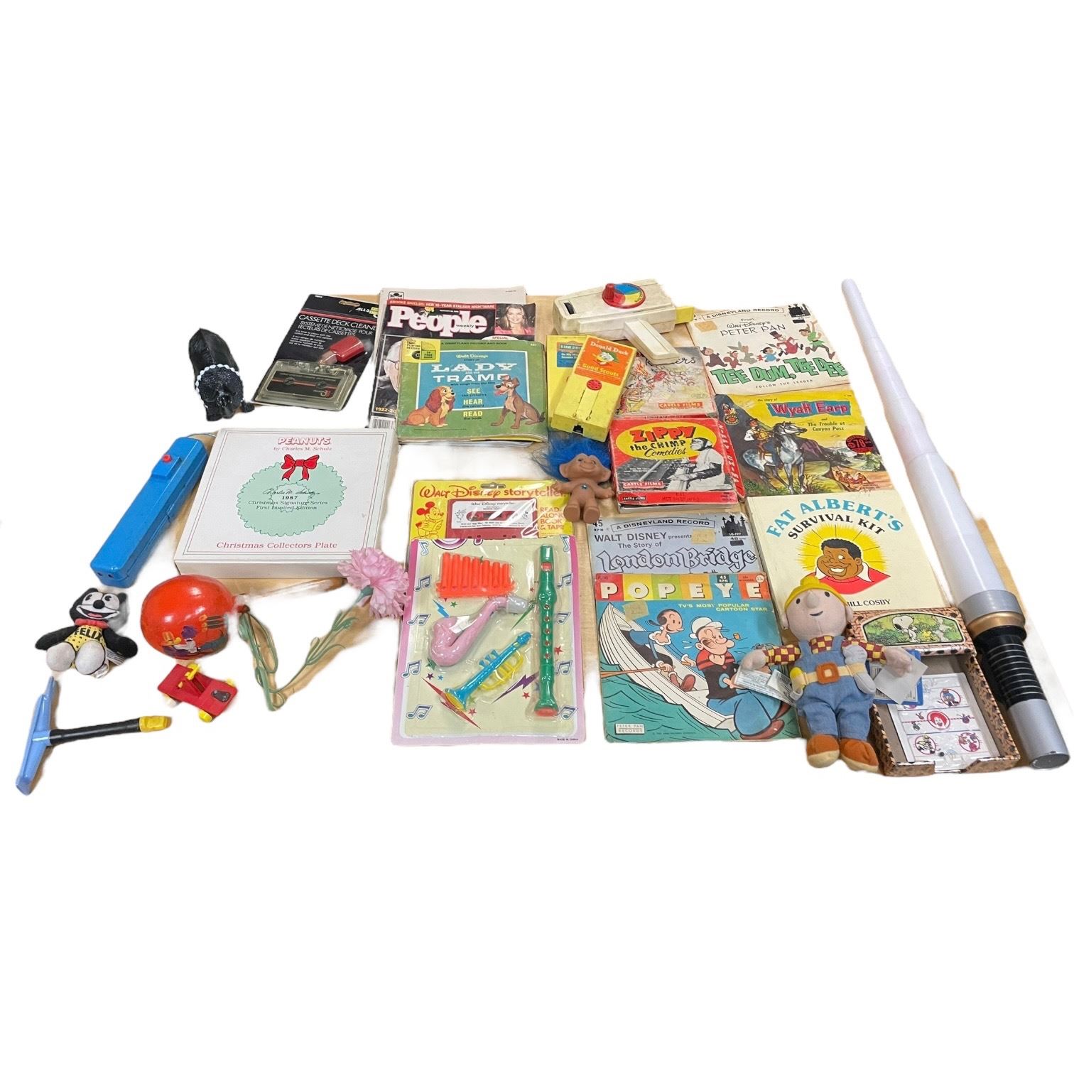 Box Full Of Assorted Vintage Collectibles, Toys, Childrens 45S, Etc.