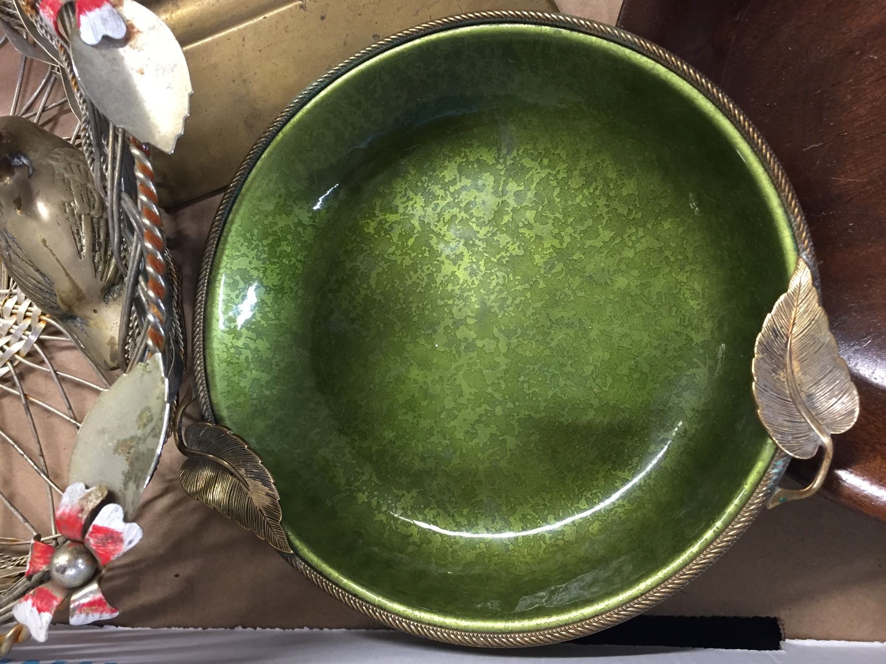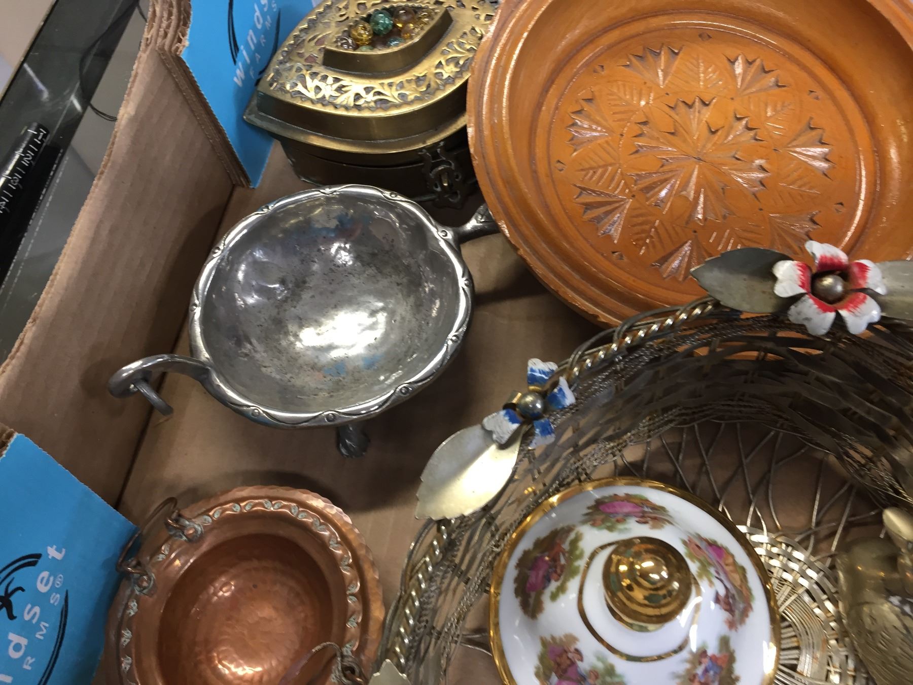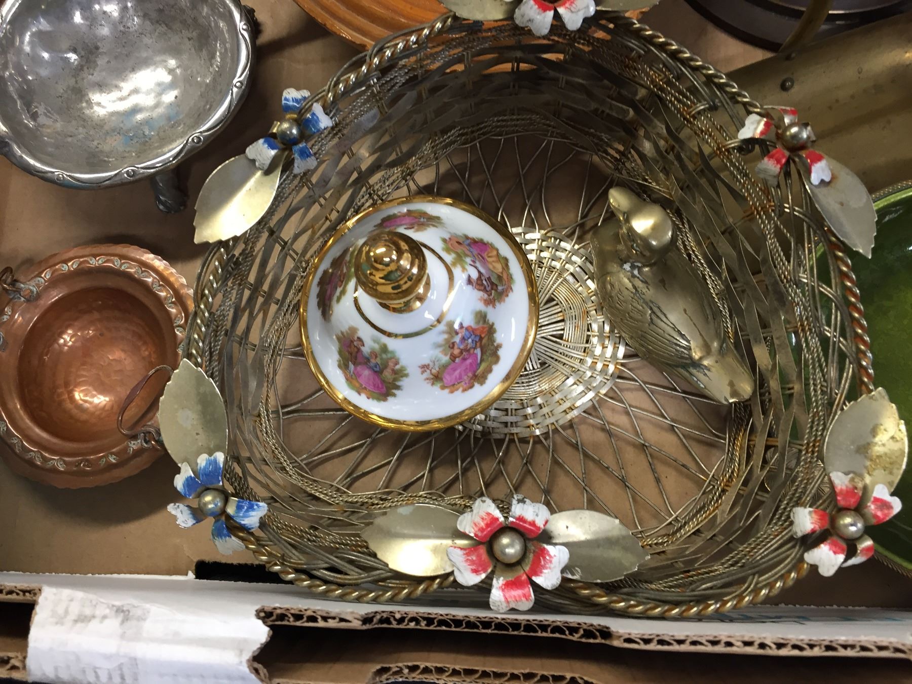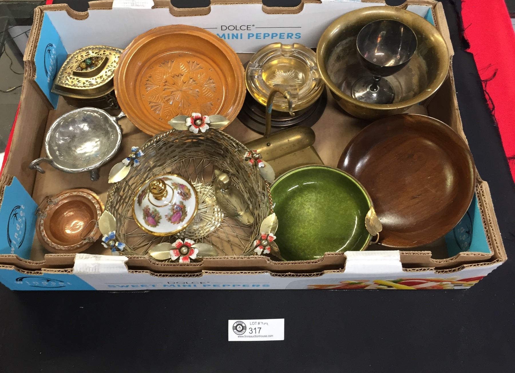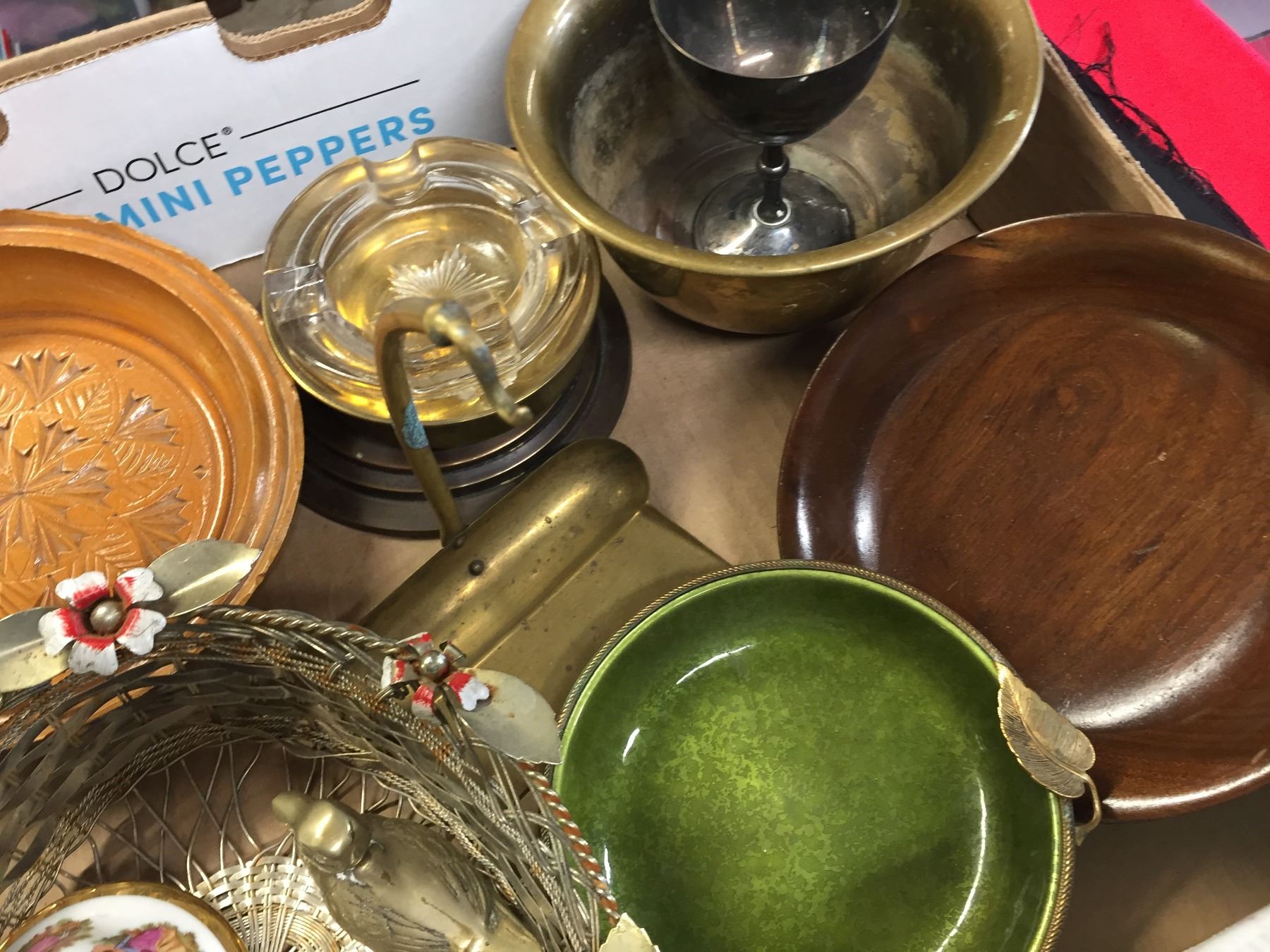 Box Lot of Vintage Dishes, and Brass. Ashtrays, Baskets, etc