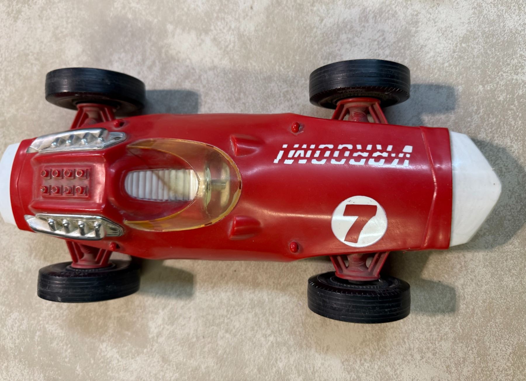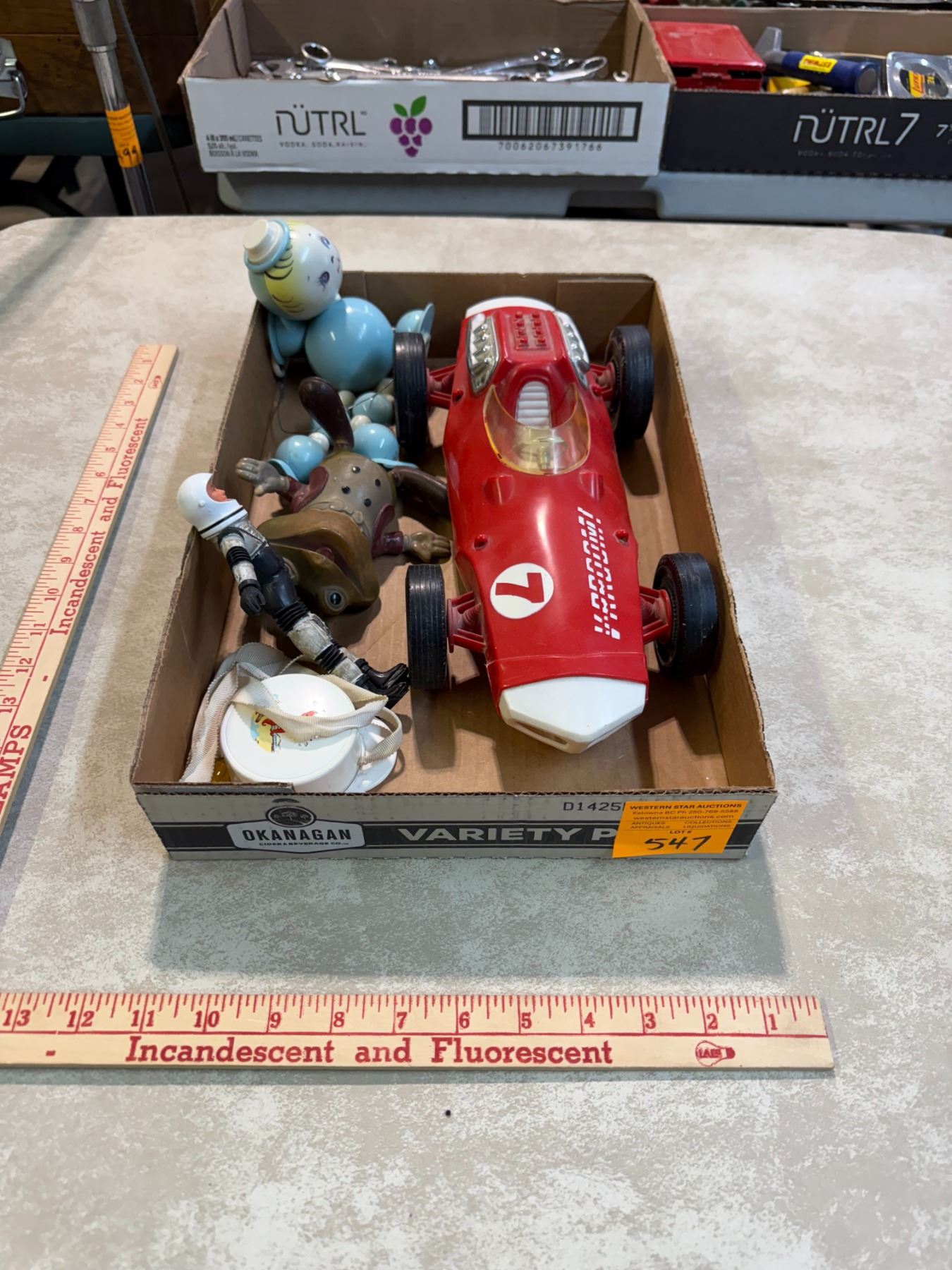 Box: Vintage Children’s Toys - Mattel “Vroom” Car, 1966 Mattel “Major Matt Mason” Astronaut, 1950s Celluloid Doll Rattle, “Waggie Wheels” Celluloid Rattle, 1940s Rempel Rubber Squeeze Frog