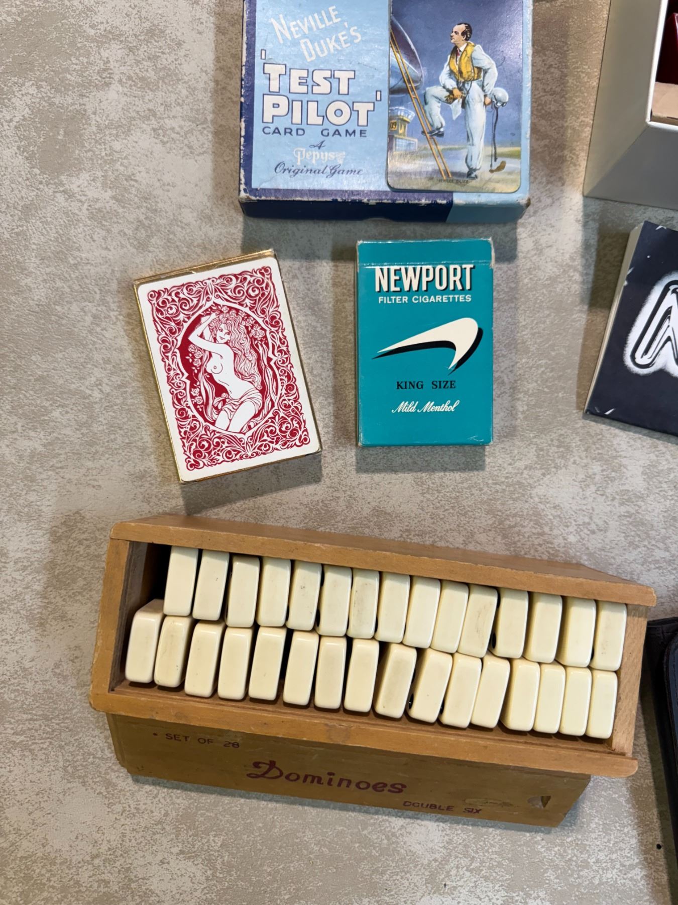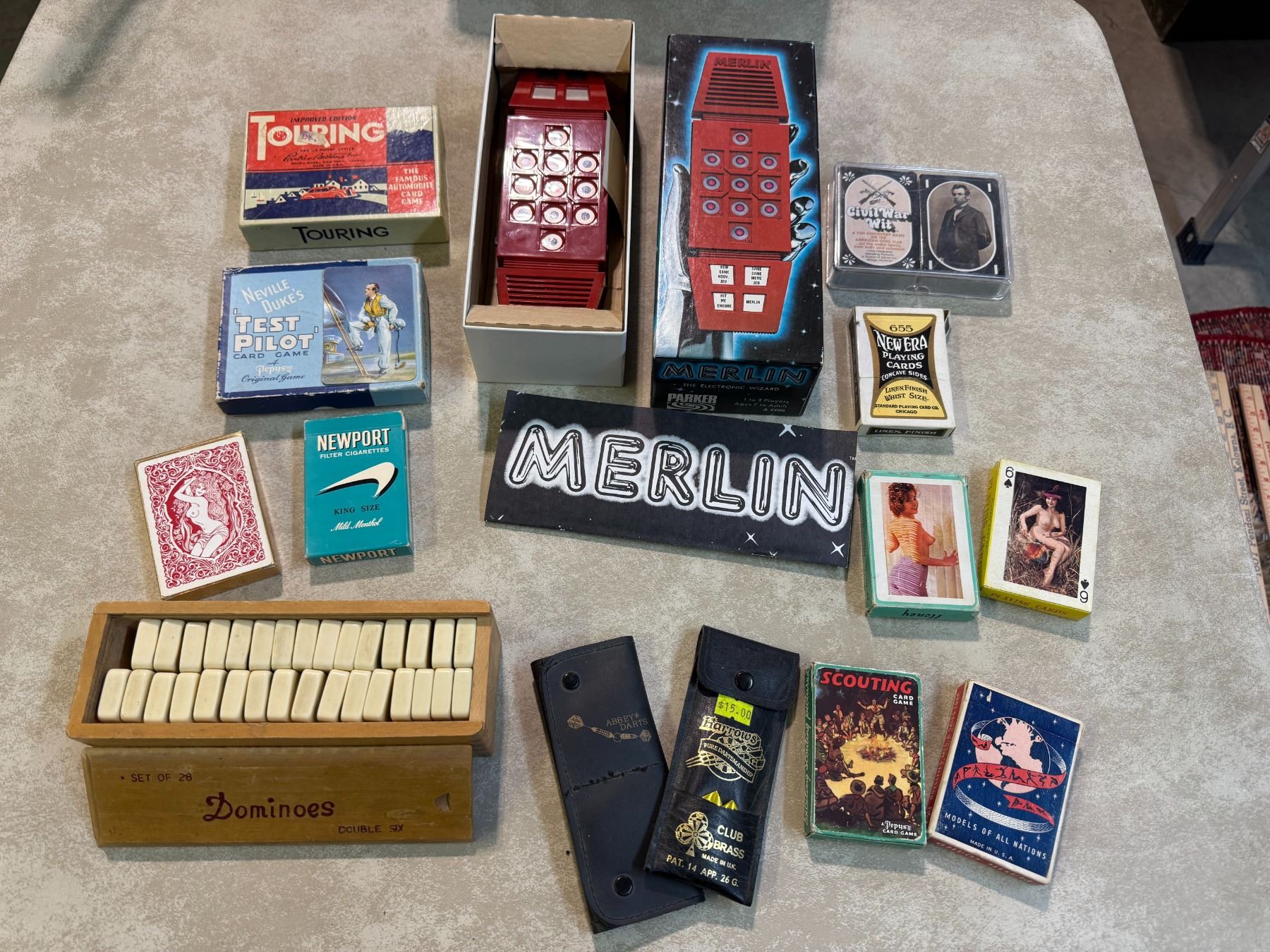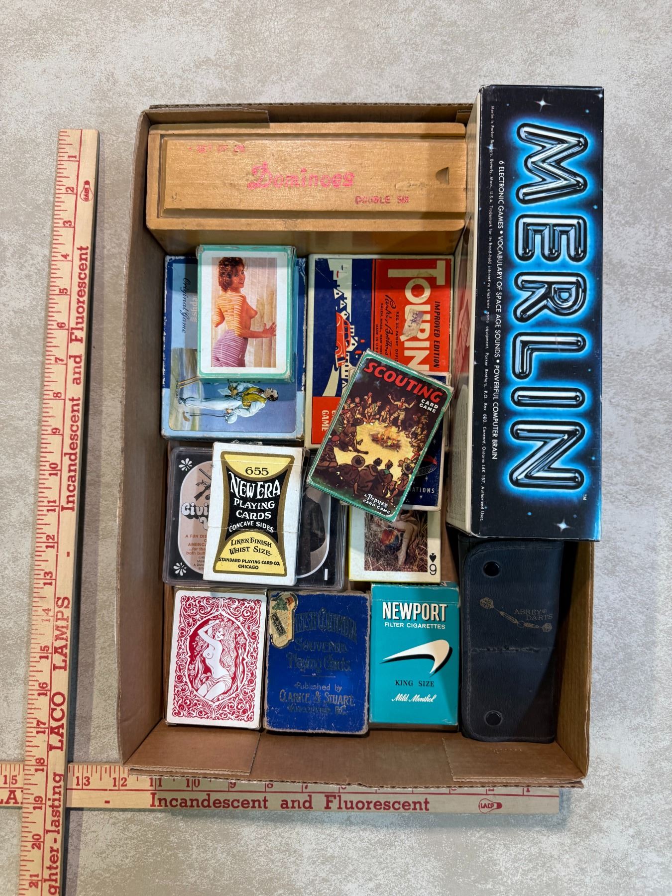 Box: Vintage Games and Playing Cards - Dominoes, Merlin, Test Pilot, Touring, Darts
