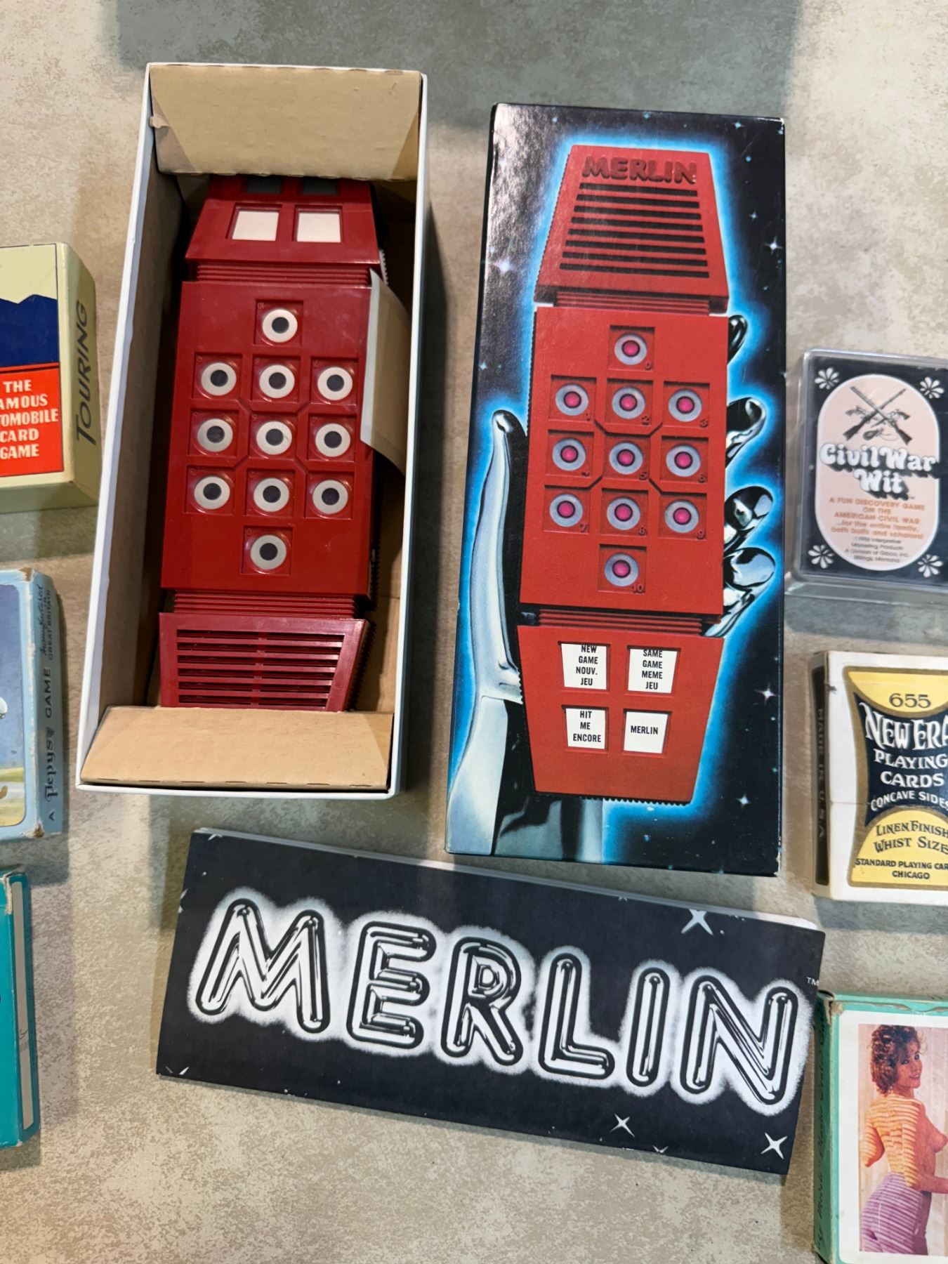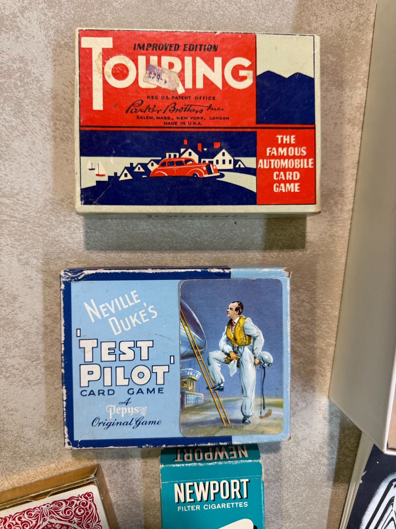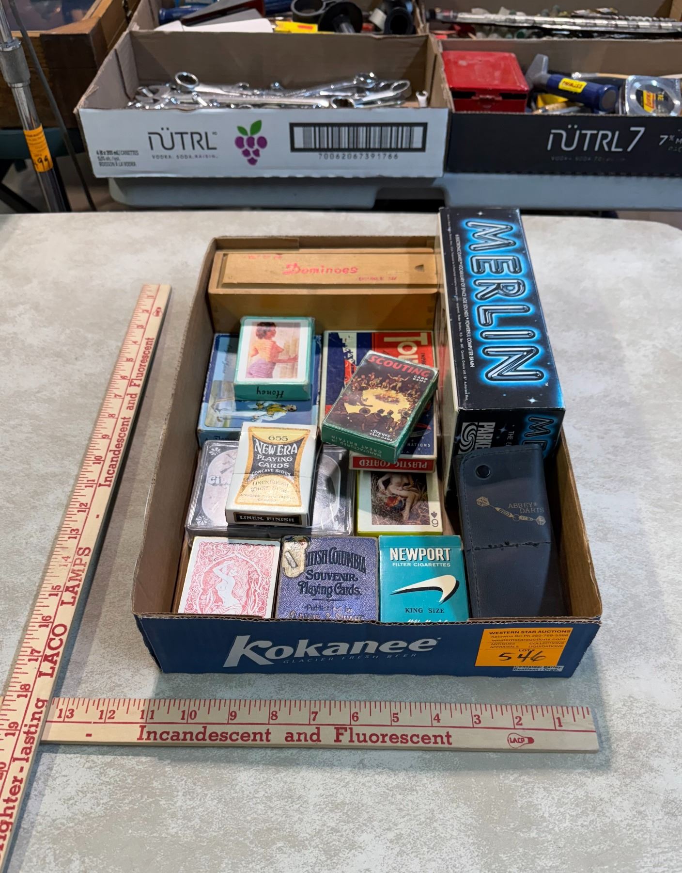 Box: Vintage Games and Playing Cards - Dominoes, Merlin, Test Pilot, Touring, Darts
