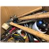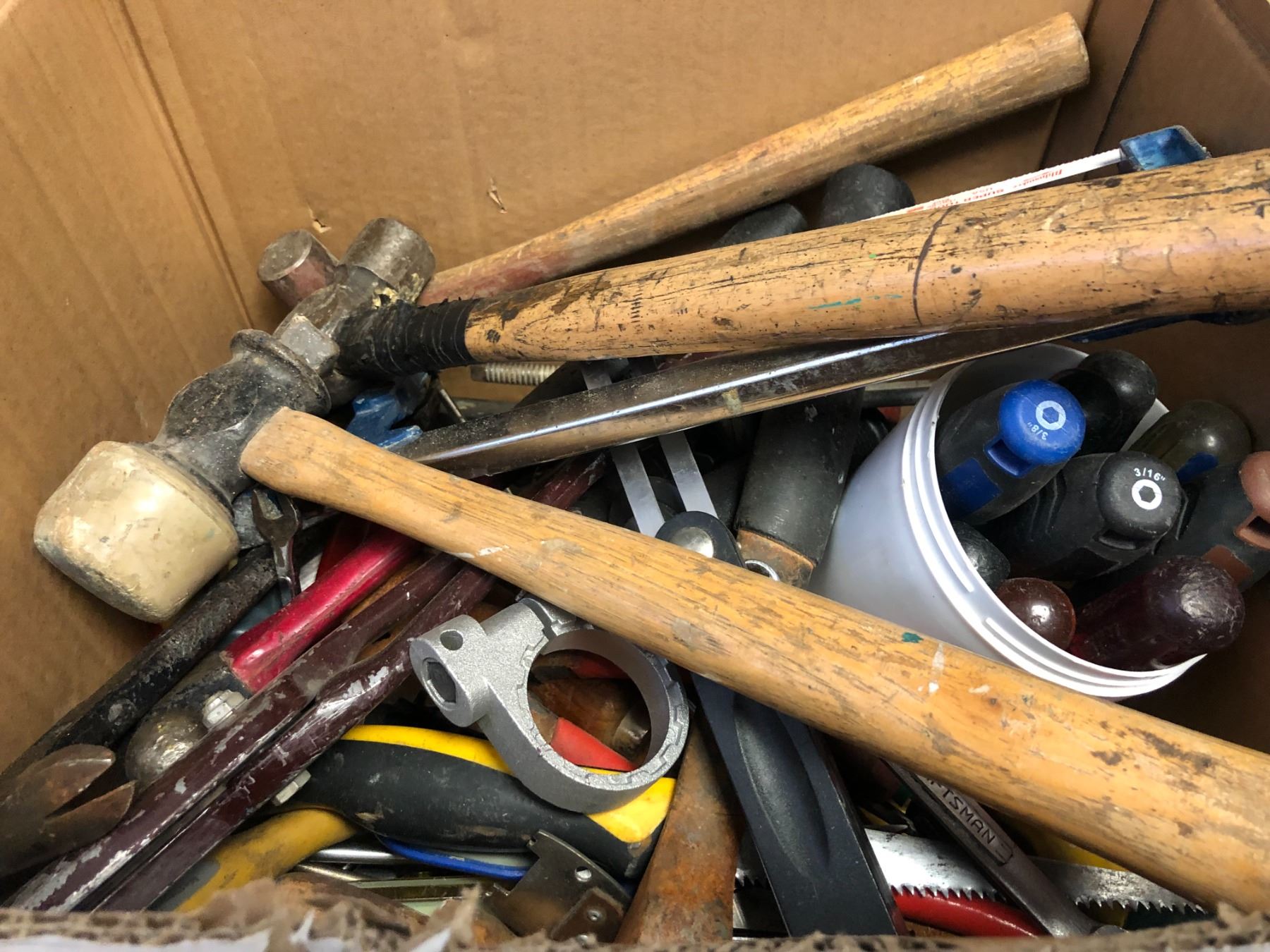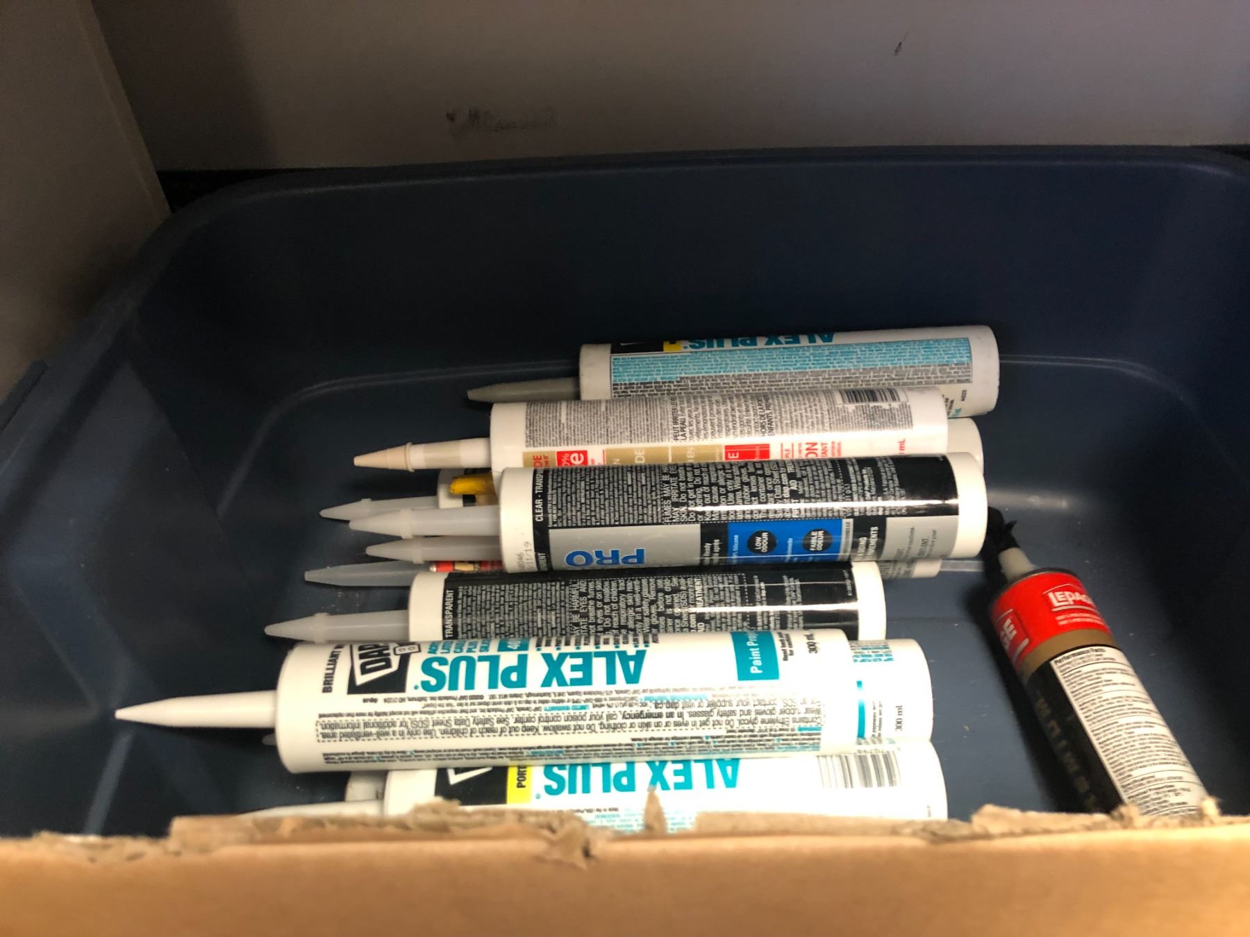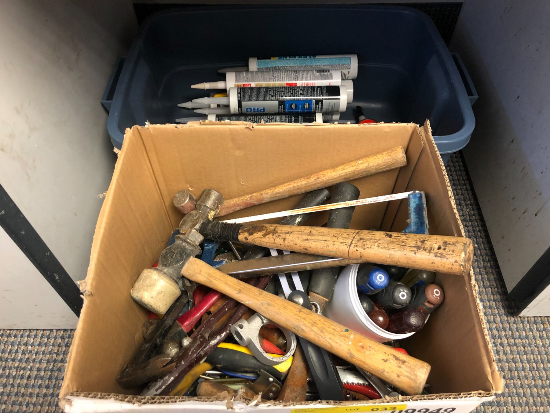Box filled w/ assorted hand tools & Rubbermaid container w/ assorted silicone