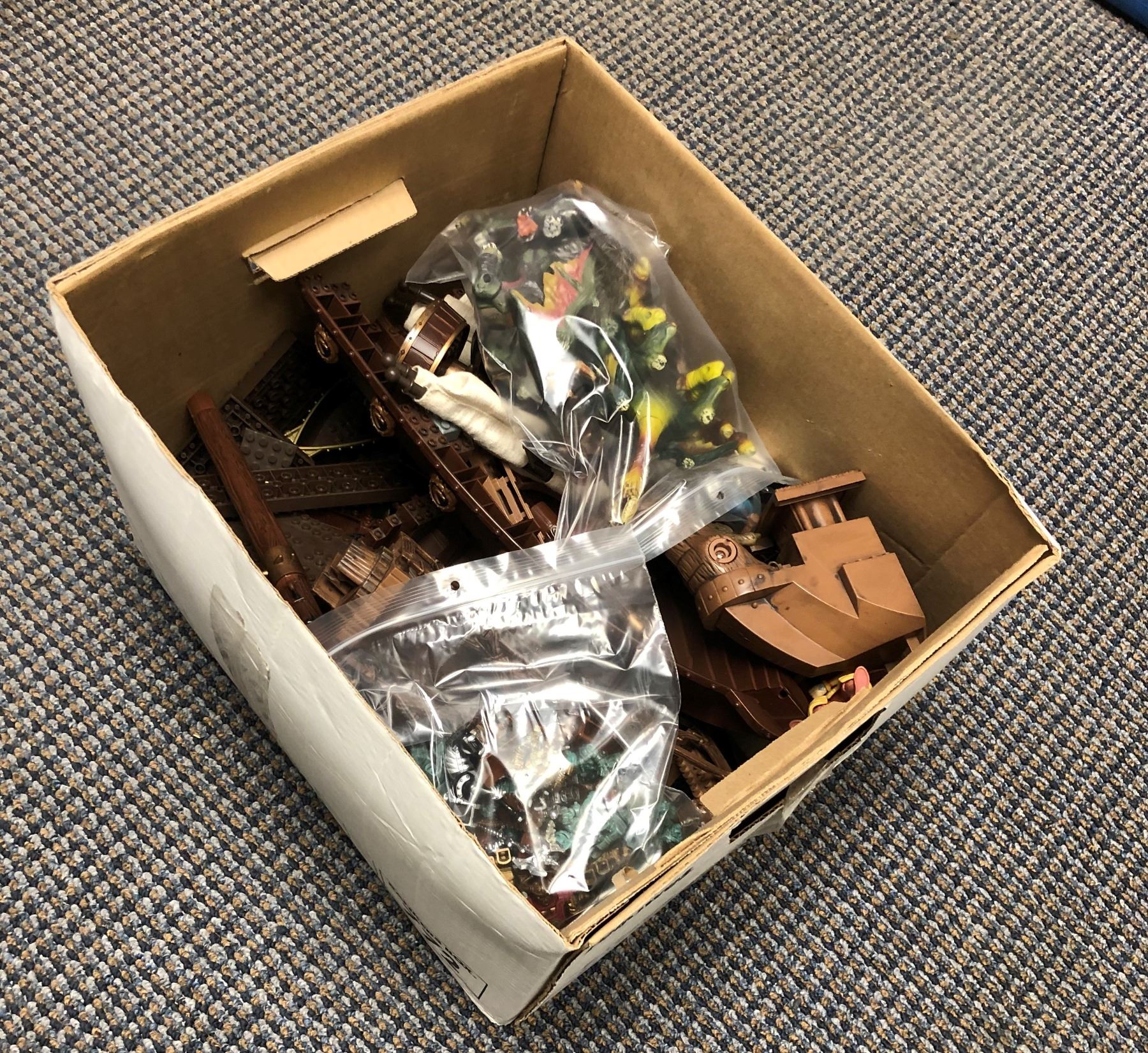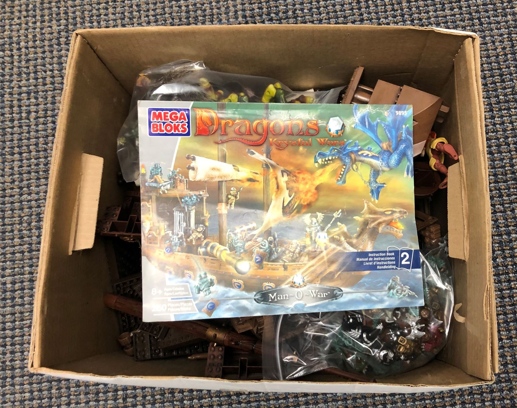 Box filled w/ assorted toys + Mega Bloks Dragons Ship in original box