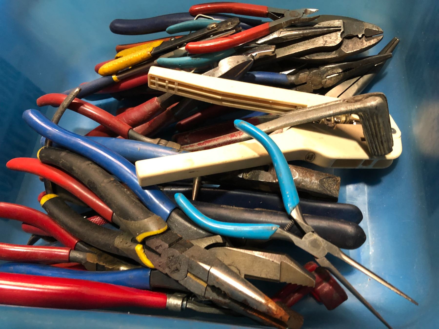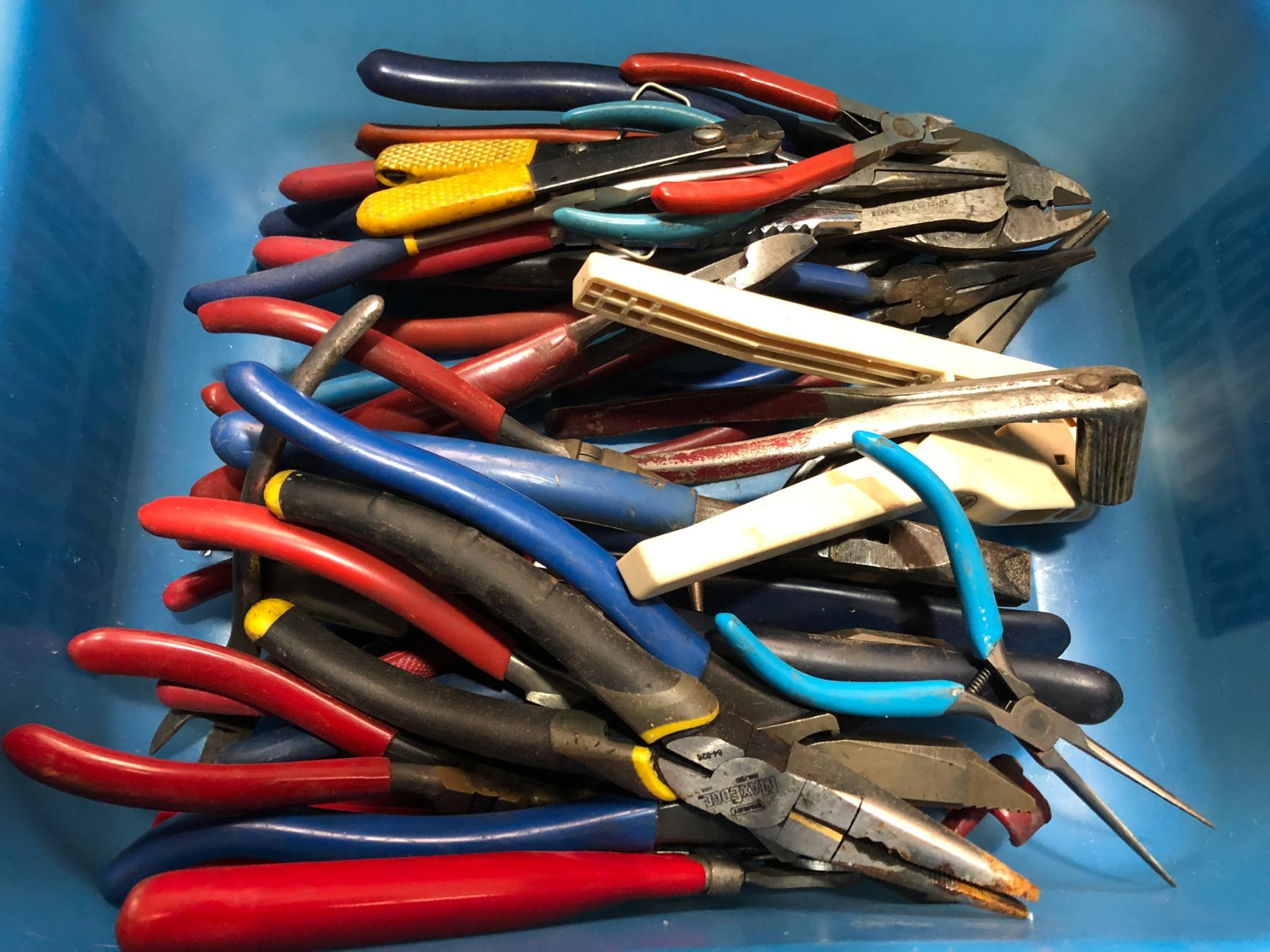 Box full of assorted pliers/ needle nose/ side cutters etc.