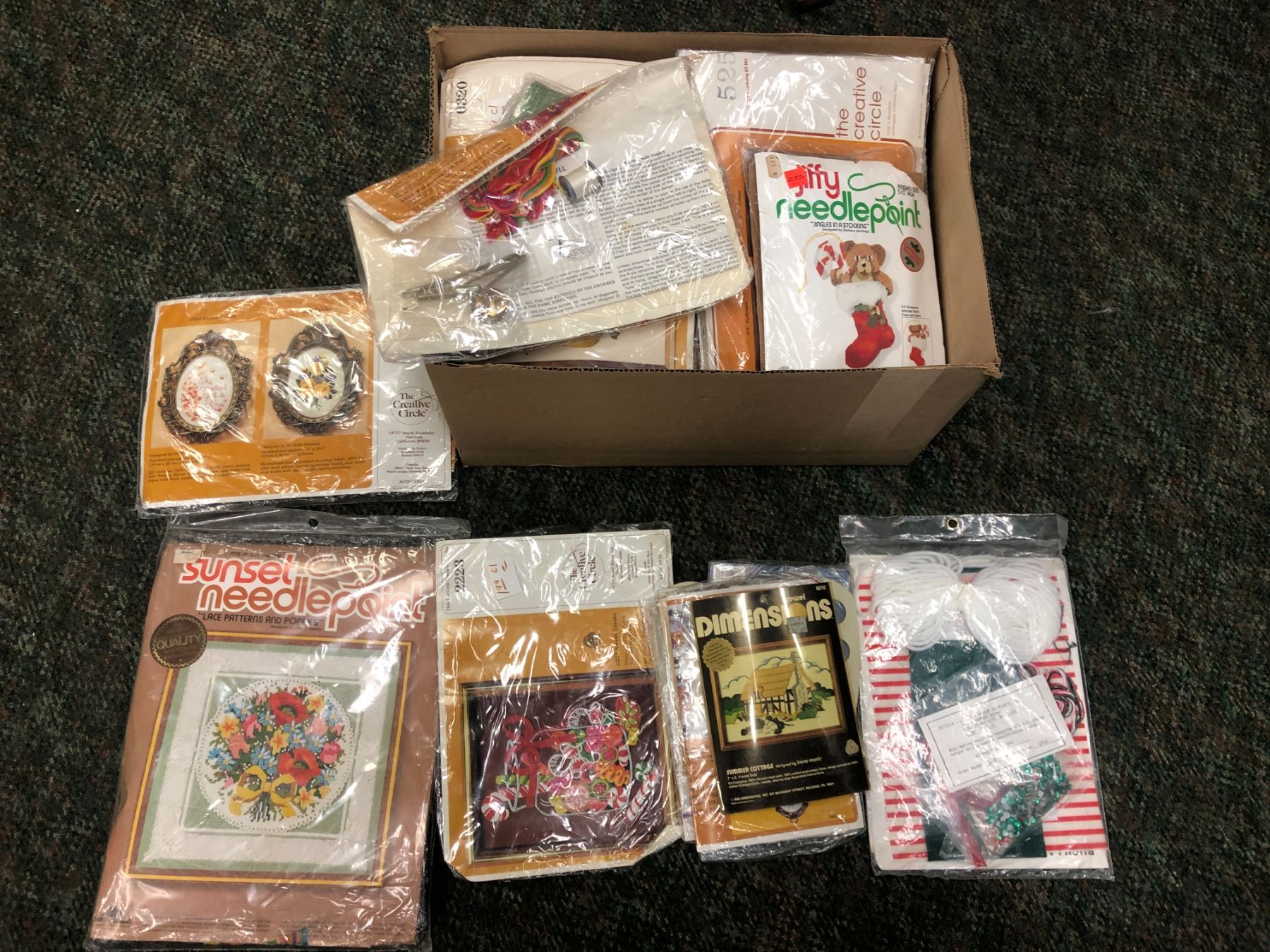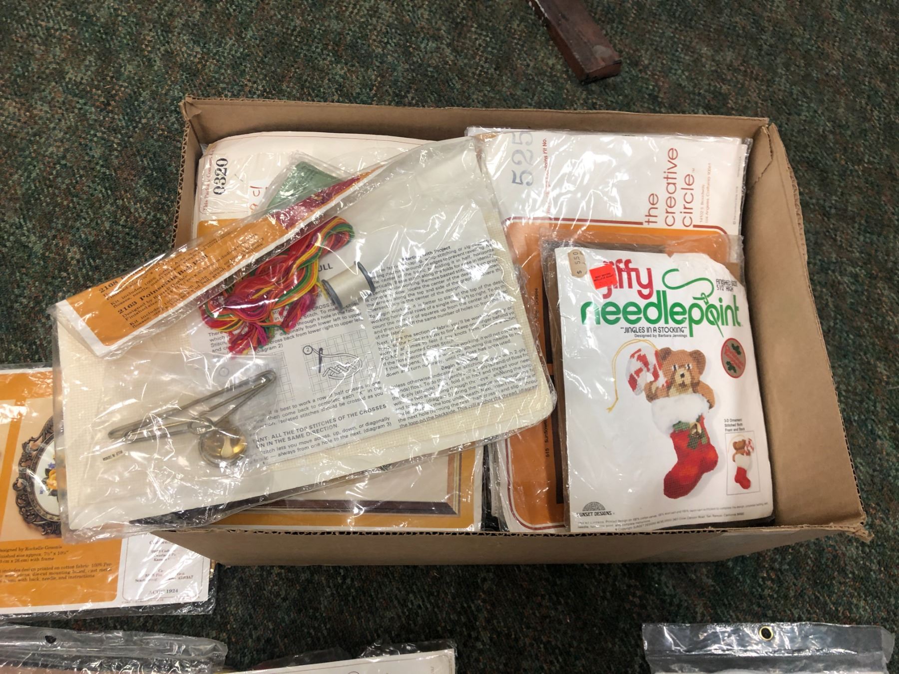Box full of assorted vintage needlepoint patterns (NOS - new old stock)