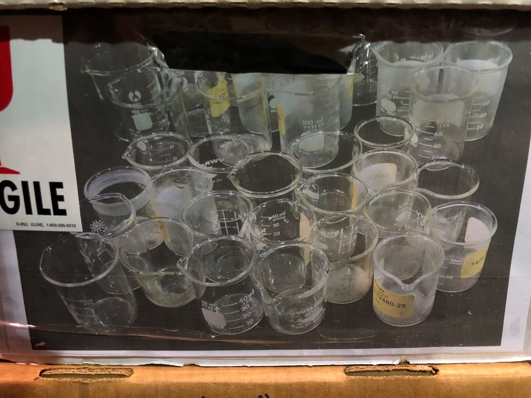 Box full of laboratory glassware - includes assorted sized graduated glass beakers
