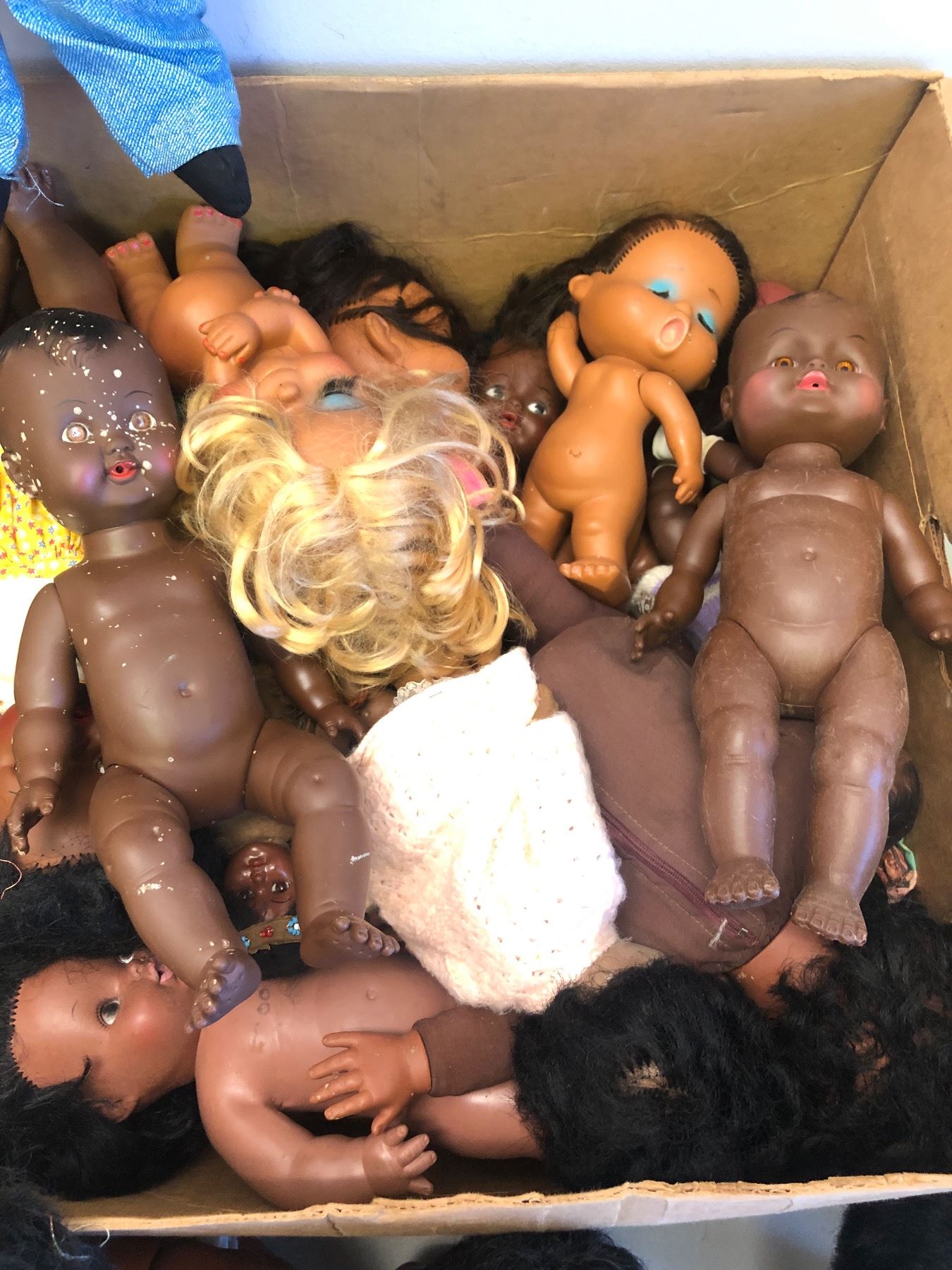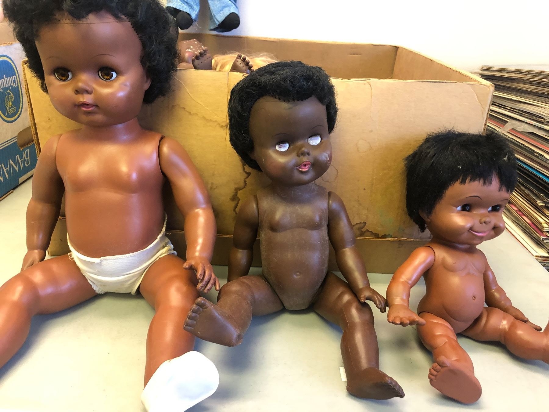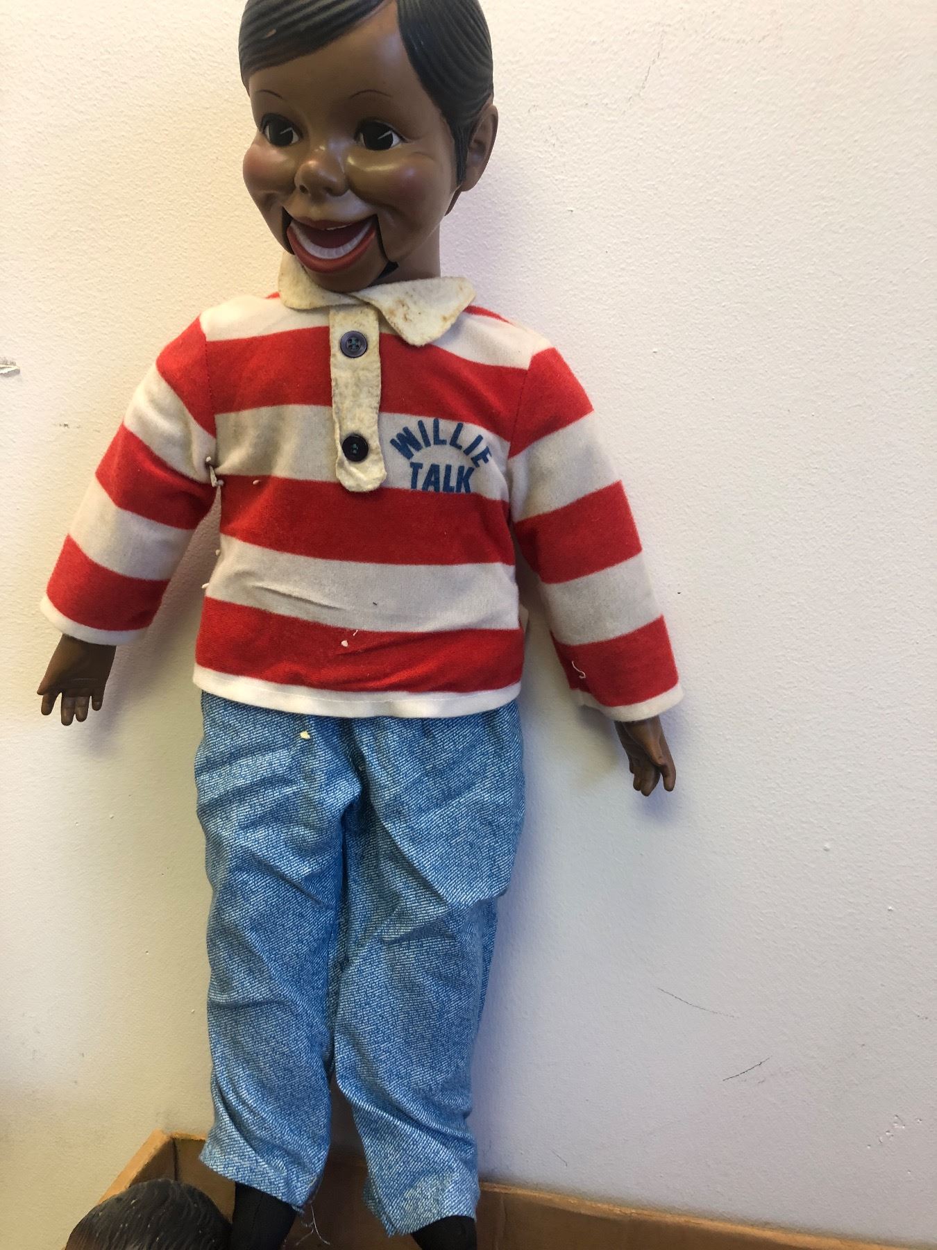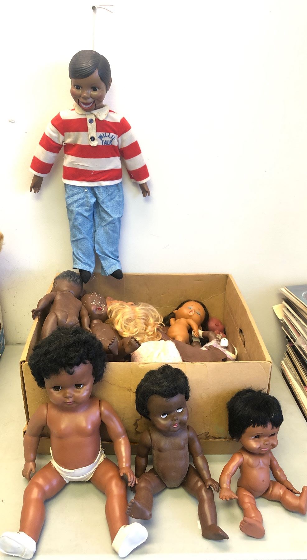 Box full of vintage estate African American baby dolls & Willie Talk ventriloquist dummy