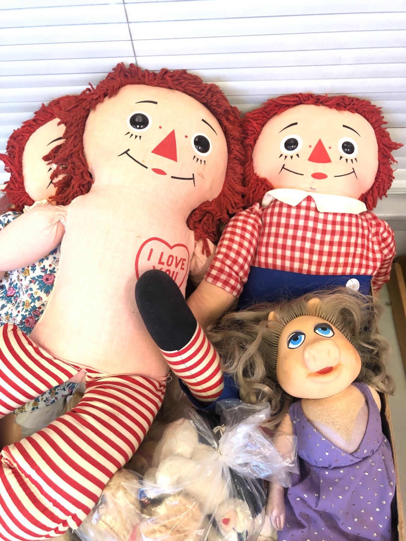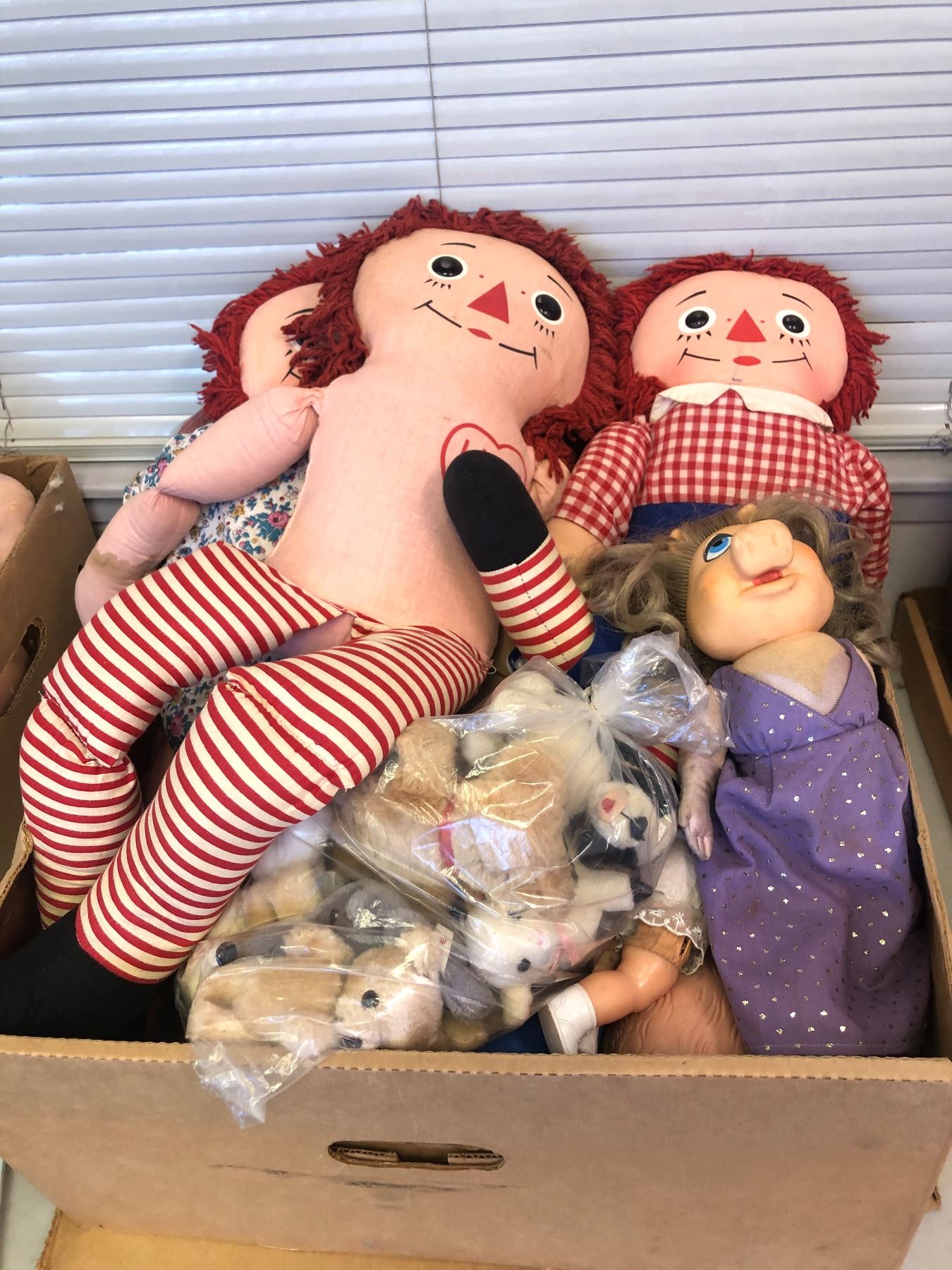 Box full of vintage estate raggedy Ann & assorted dolls - includes miss piggy rubber face doll / doll body parts etc