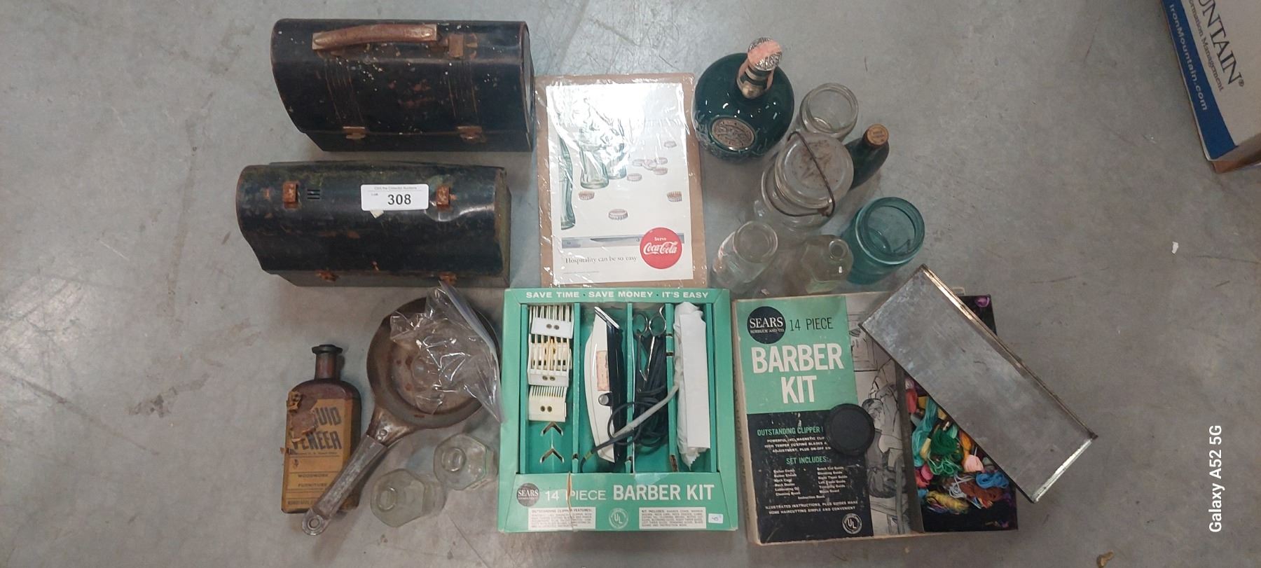 Box lot inc. glass jars, barber kit, metal lunchkit etc