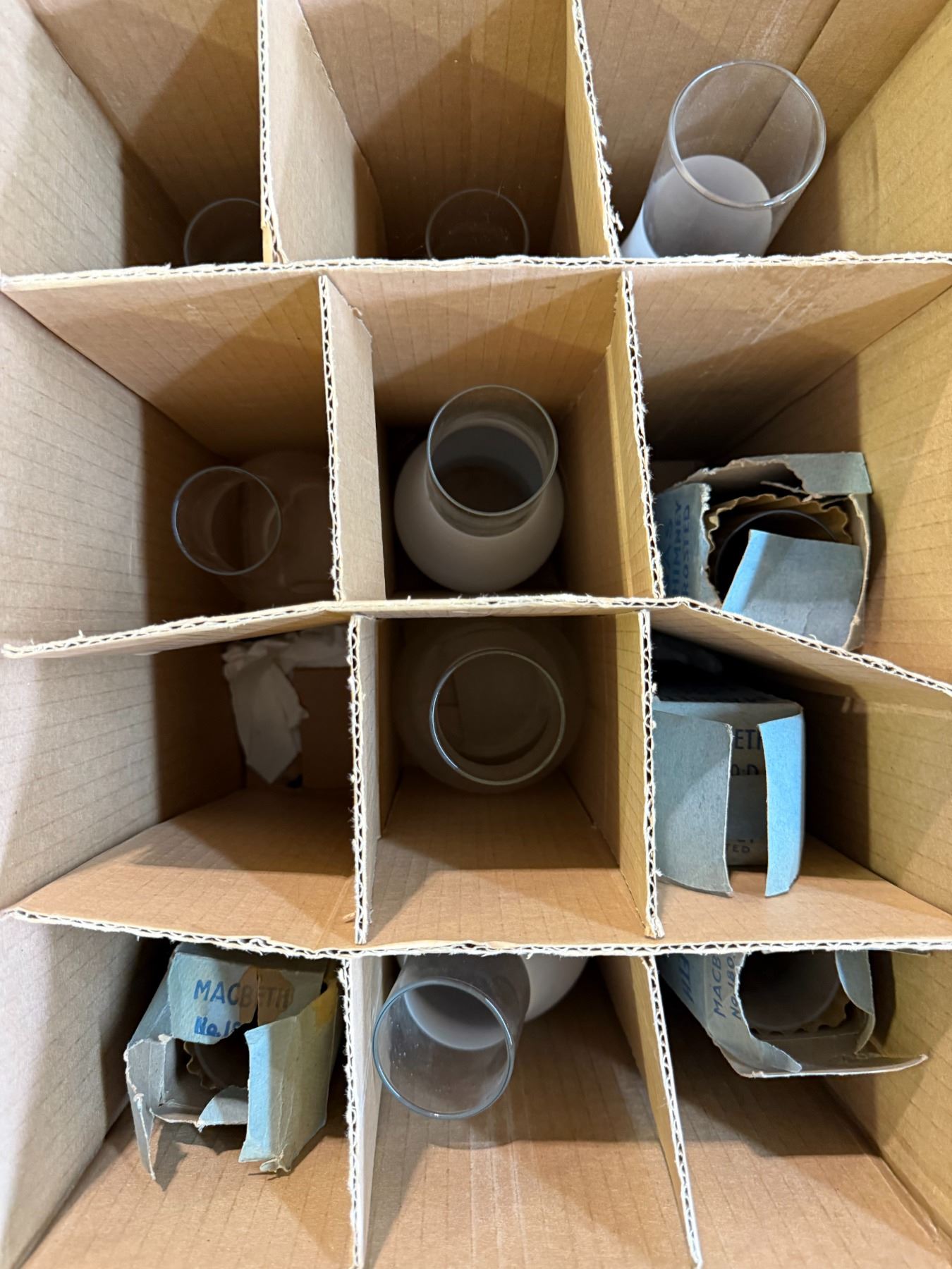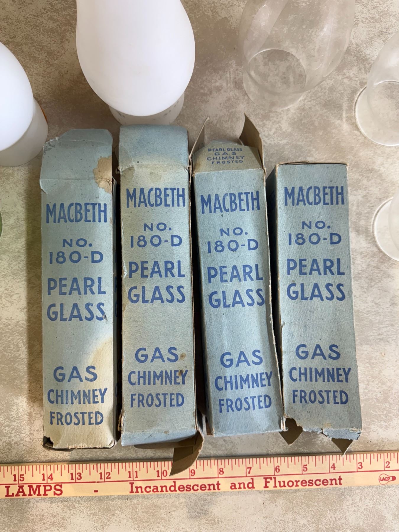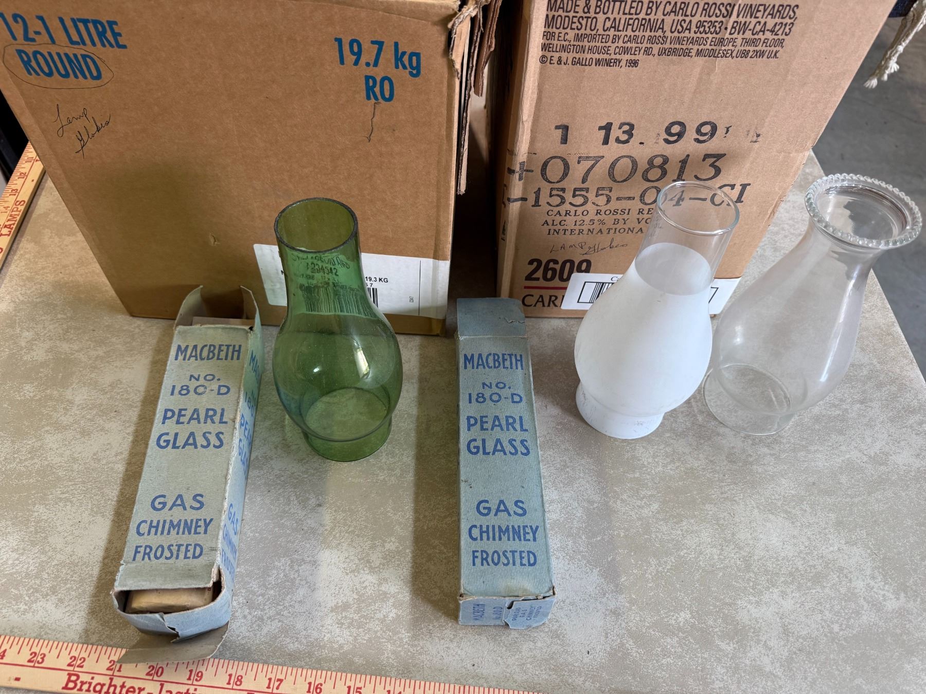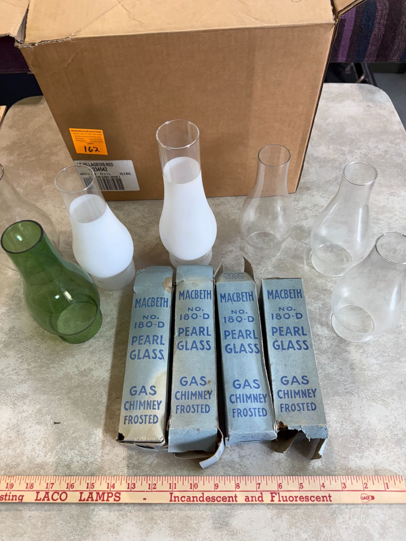 Box of 12 assorted Oil Lamp chimneys (including New old stock MacBeth Pearl Glass)