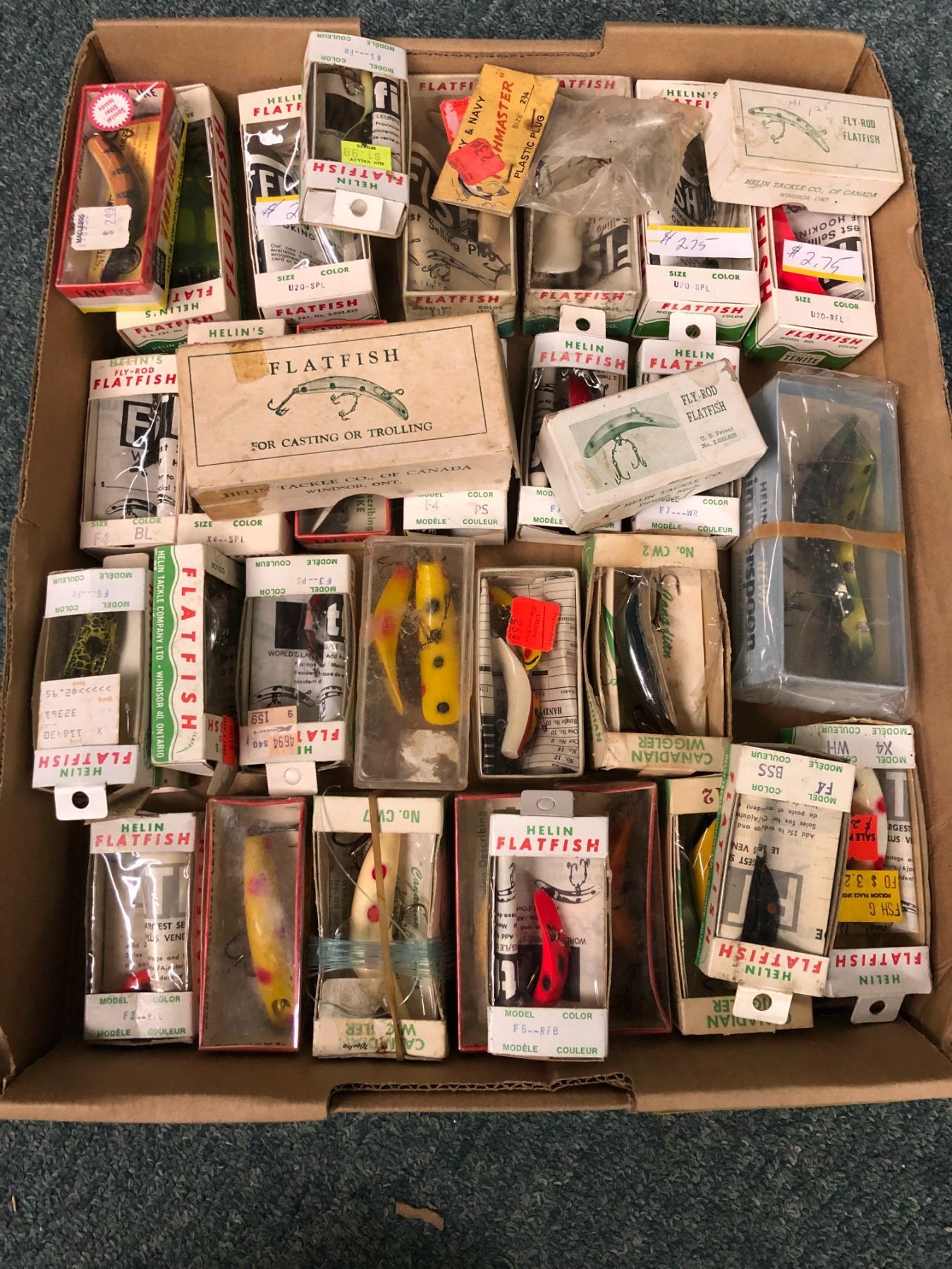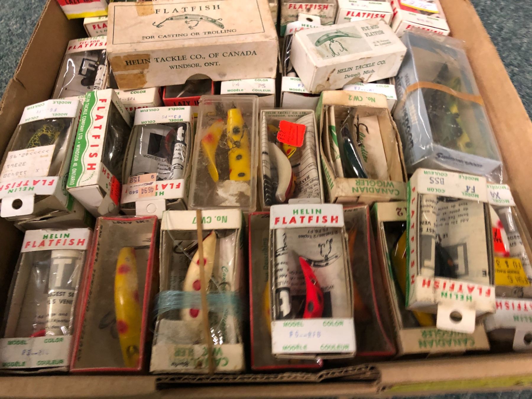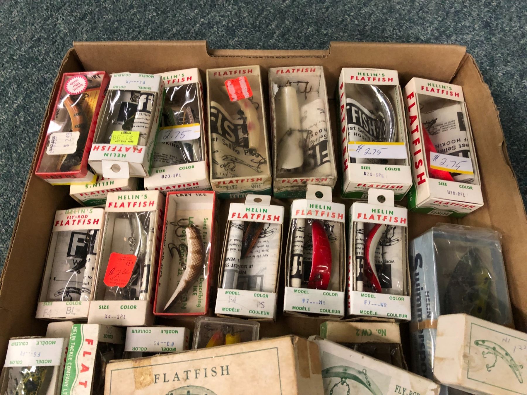 Box of 37 assorted vintage flat fish fishing lures (most in original boxes)