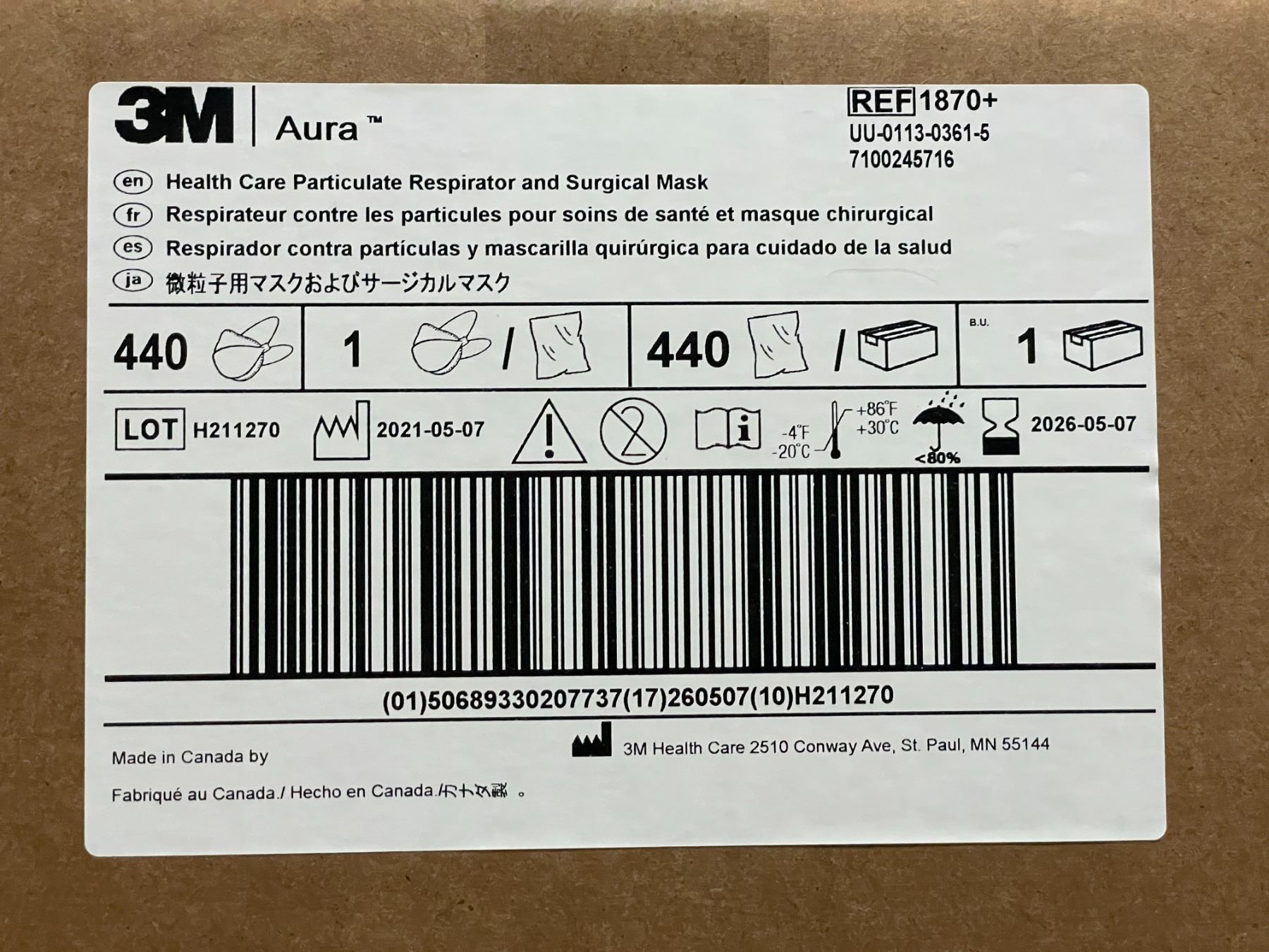 Box of 3M Aura Health Care Particulate Respirator and Surgical Mask,1870+, N95, 440 per case (2026 E