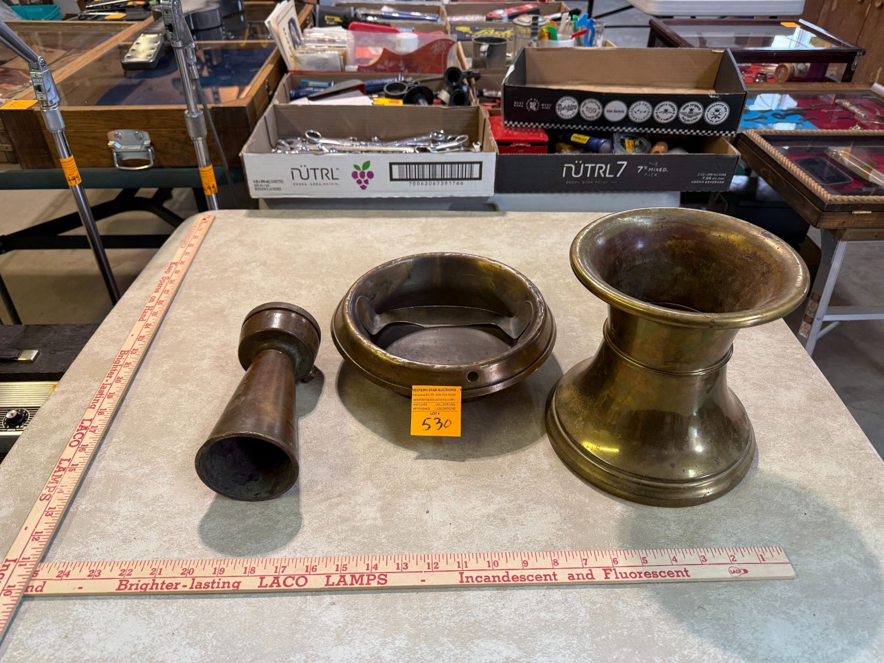 Box of Antique Brass items: Airhorn, Spittoon, and Creamer Lid