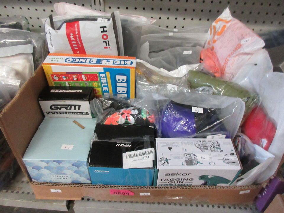 Clothing, tagging gun, toys, hand grip exerciser, scented candle, and more.
