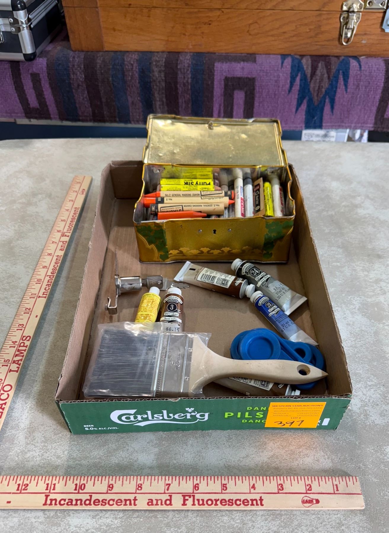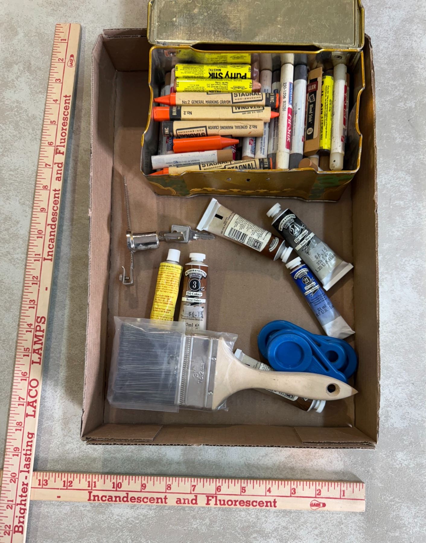 Box of Assorted Paint Supplies and Fill Sticks for Flooring