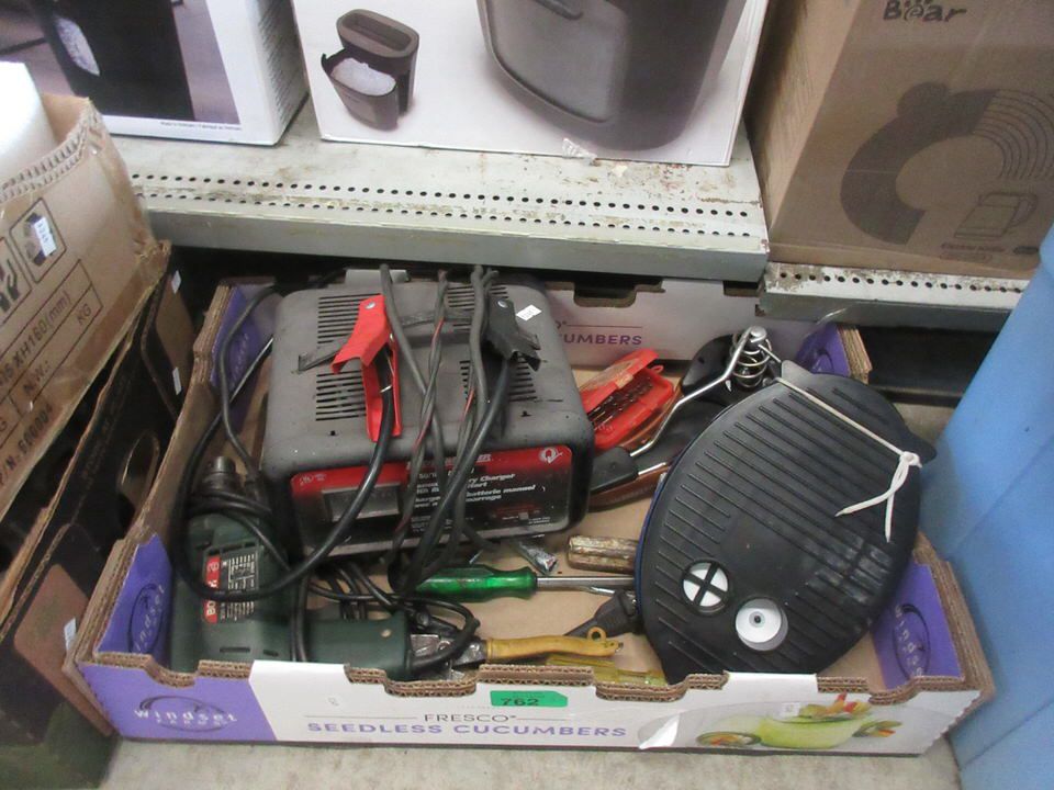 Bike seat, drill, battery charger, foot operated inflator, screwdrivers, and more. Preowned.