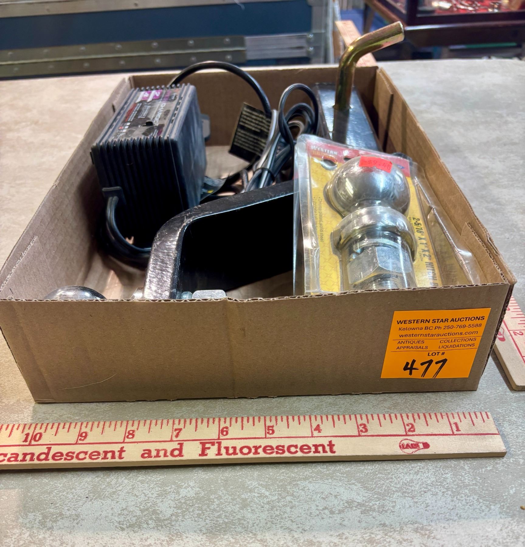 Box of Automotive Items: Trailer Hitch, Hitch Ball (New), Battery Charger