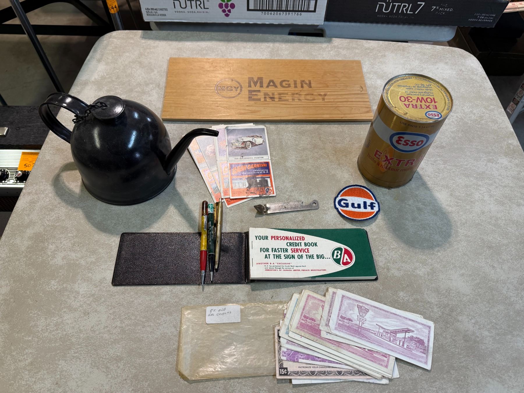 Box of Misc. Vintage Oil Items: Oil Can, Oil Pens, BA Oil Items, Gas Coupons