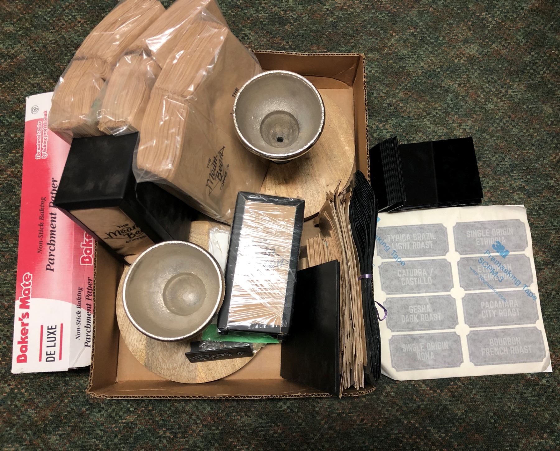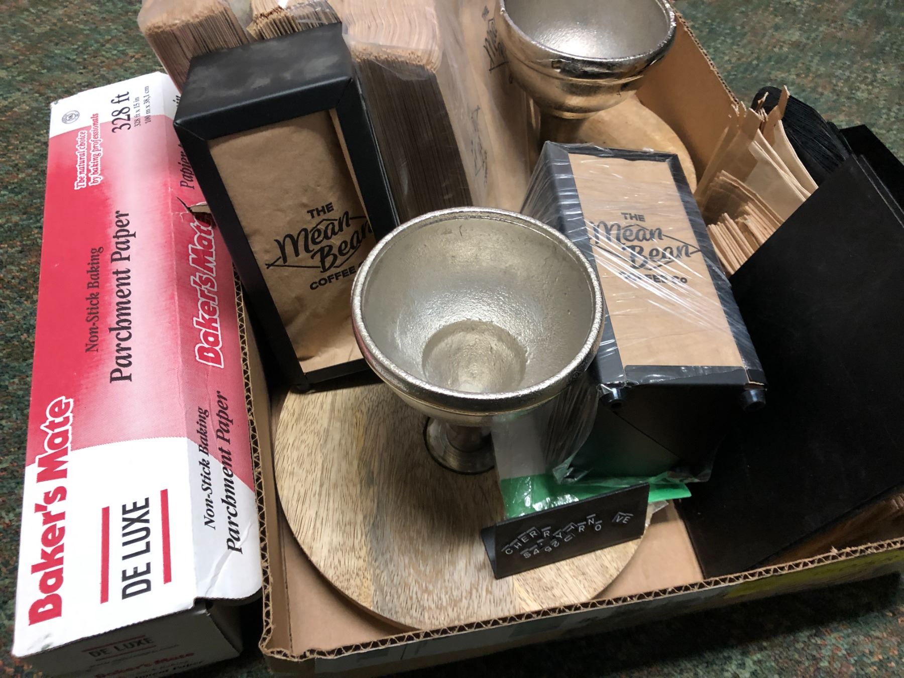 Box of "The Mean Bean" Coffee Co coffee shop props from the Blockbuster partial animated movie - napkin dispensers/ napkins/ menu holders/ small coffee bags