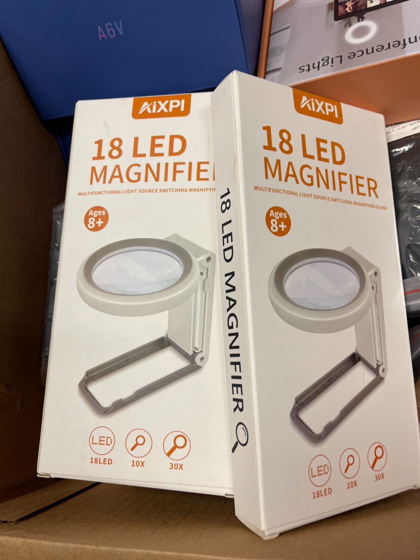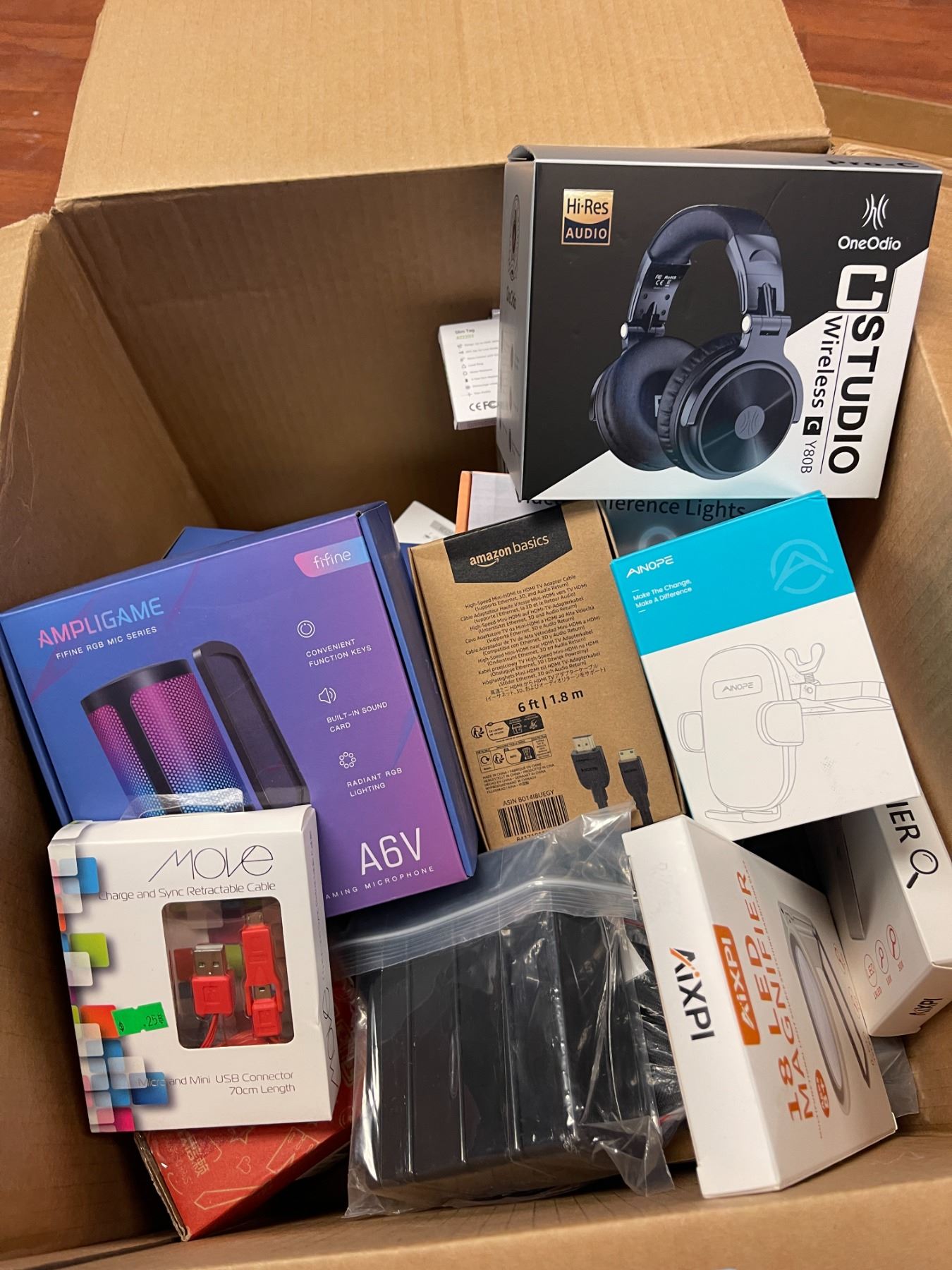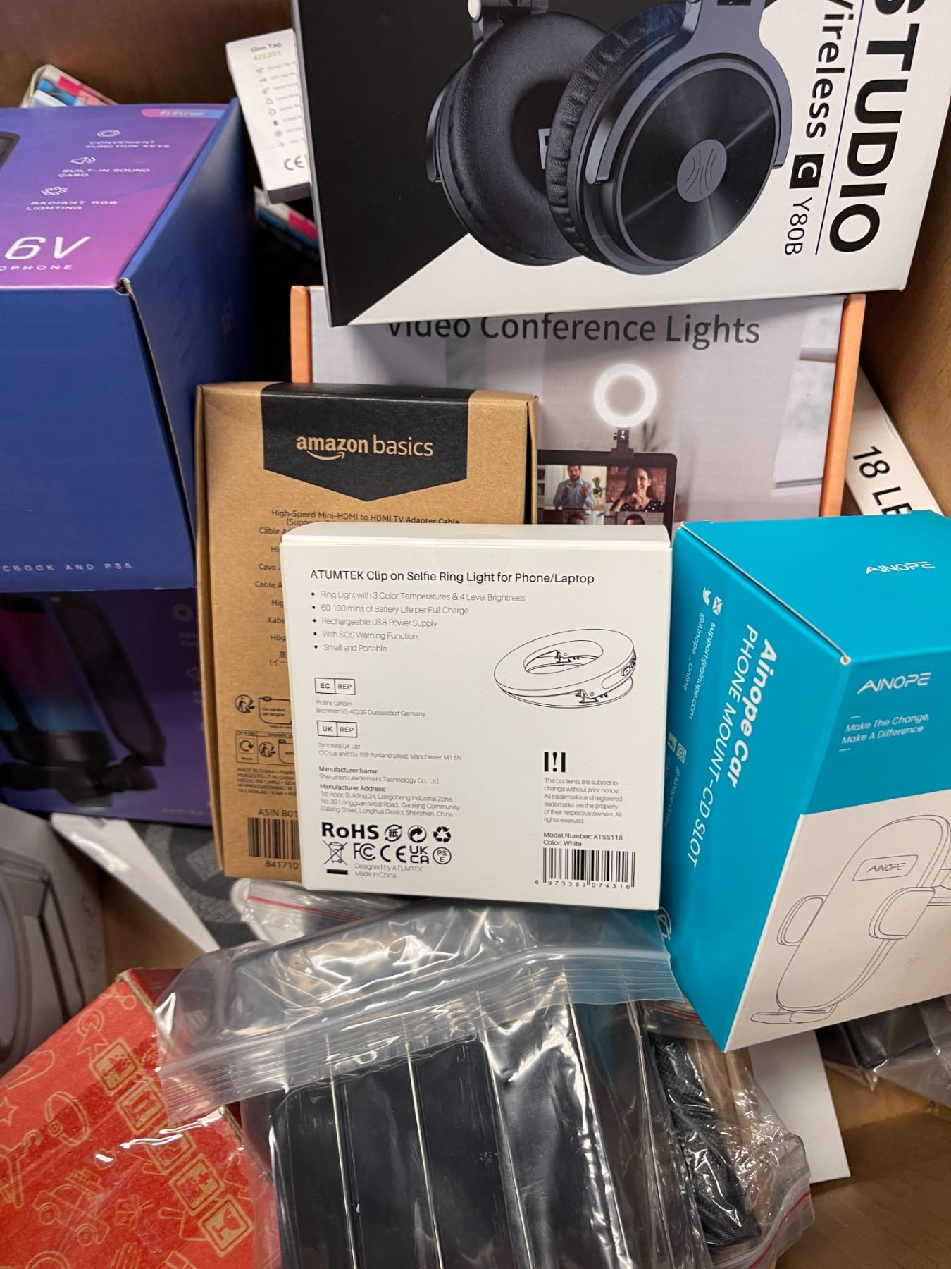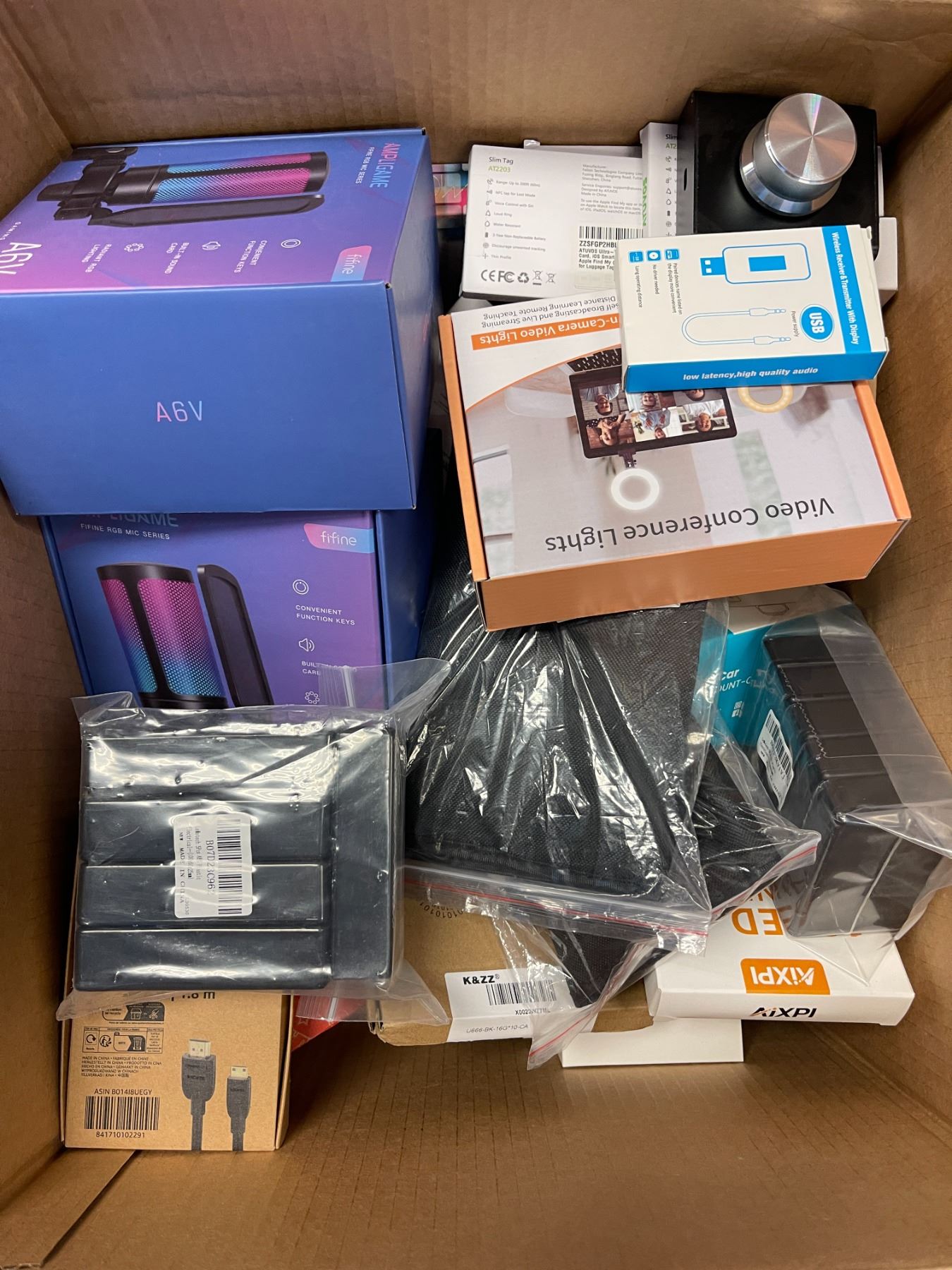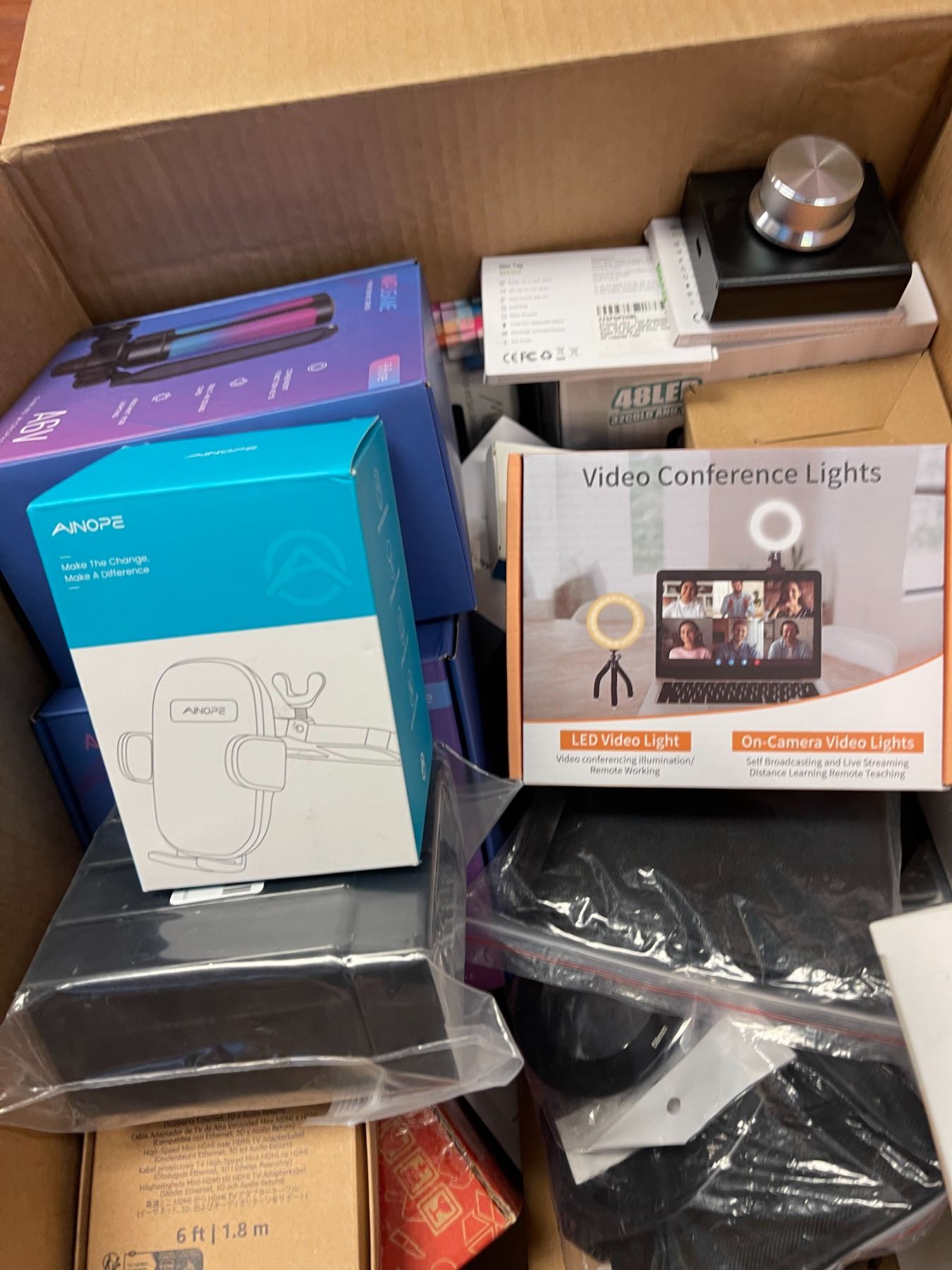 Box of Various Electronics - RGB Mics, Video Conference Lights, Phone Mount, LED Magnifier, Etc.