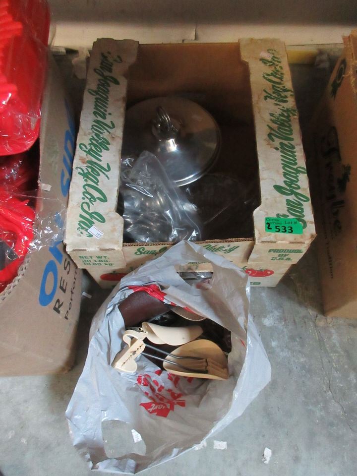 Box of Vintage Silver Plate & Bag of Shoe Forms
