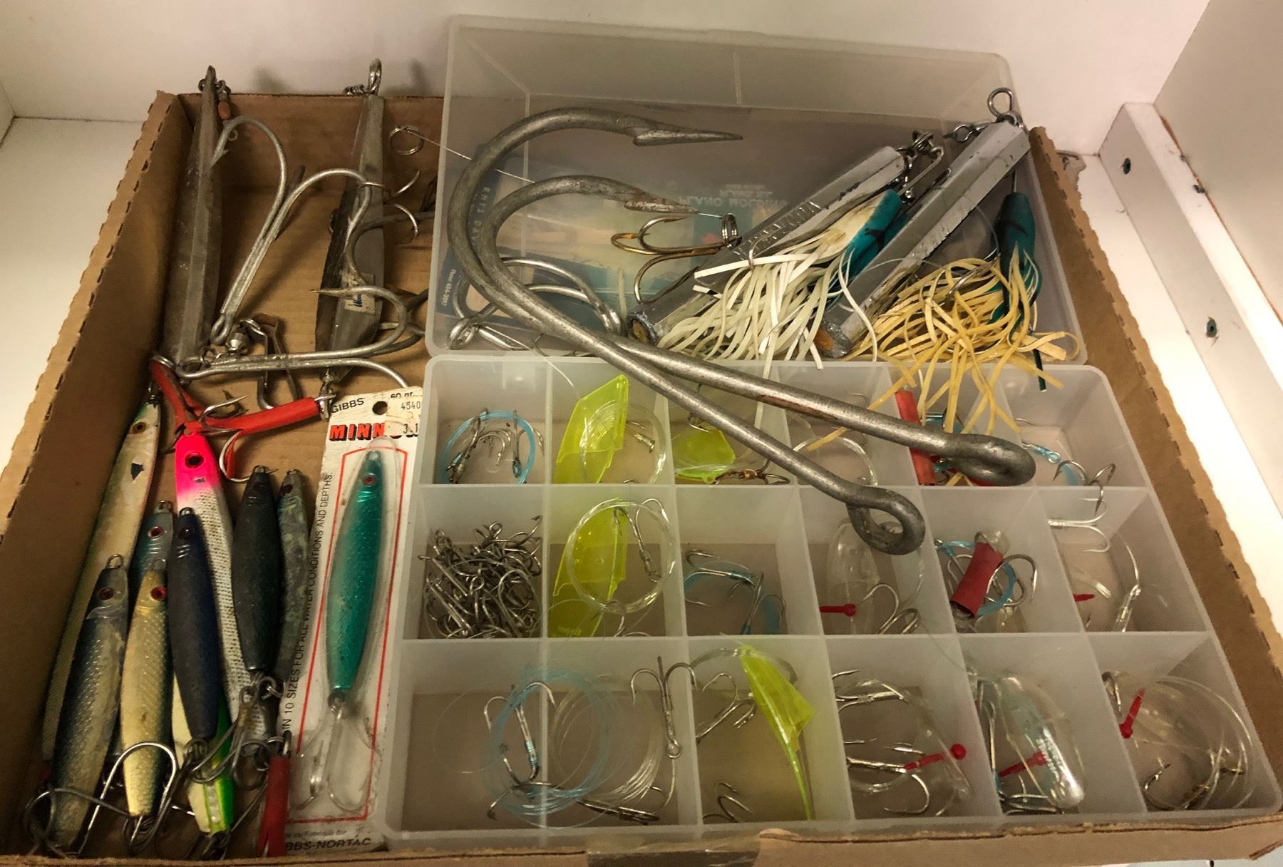 Box of assorted ocean fishing tackle - cod jigs/shark hooks/teasers etc.