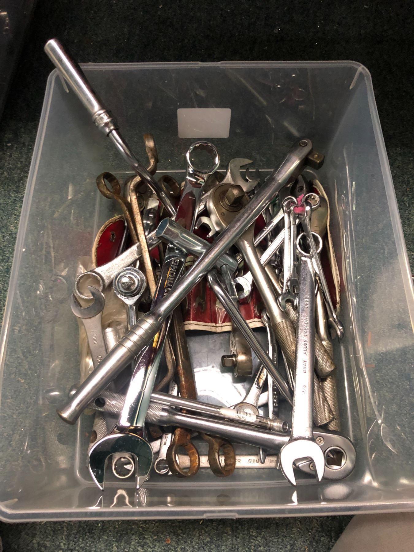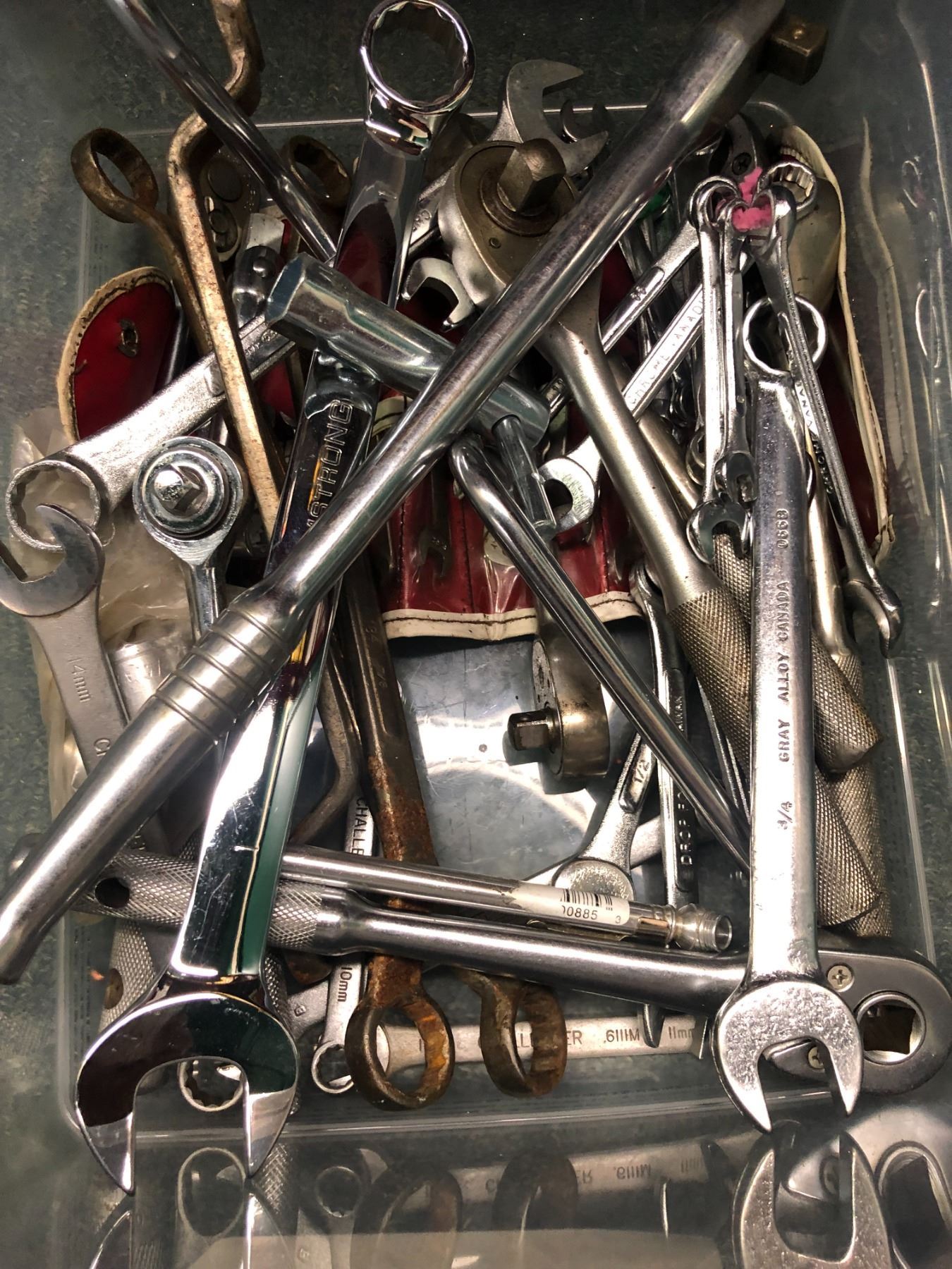 Box of assorted tools/ combination wrenches/ sockets, etc. - Gray/ Armstrong etc.