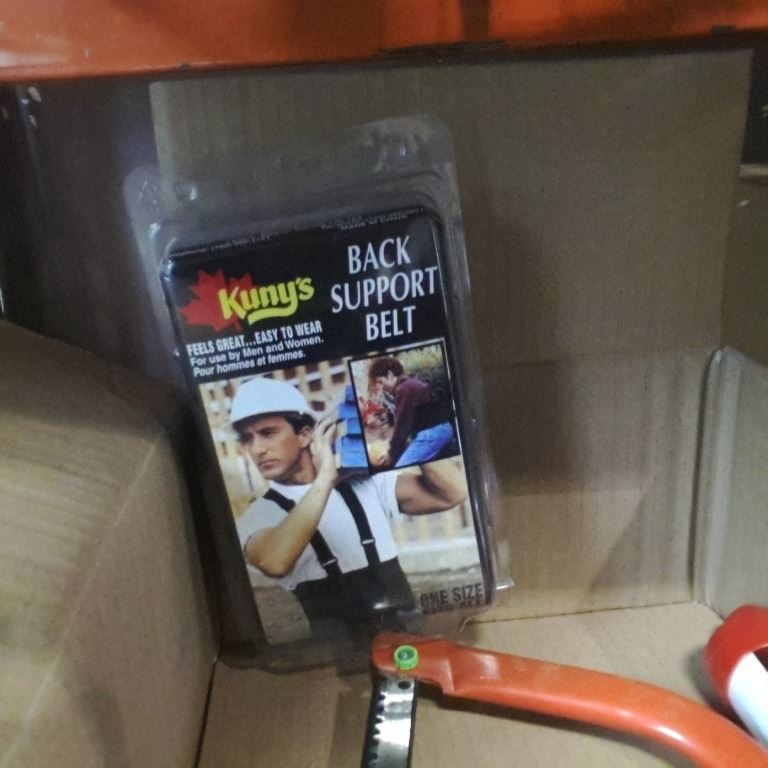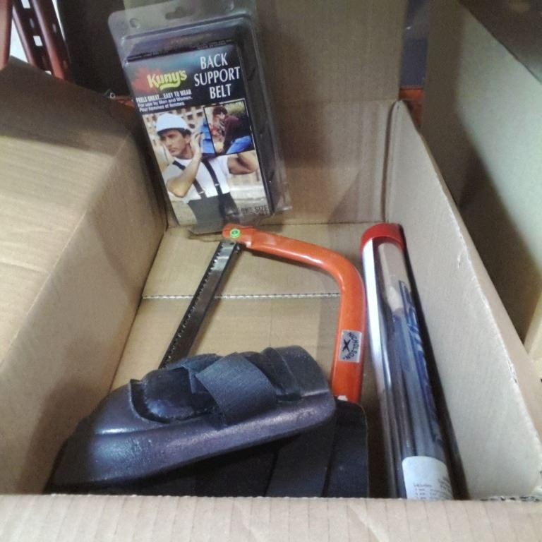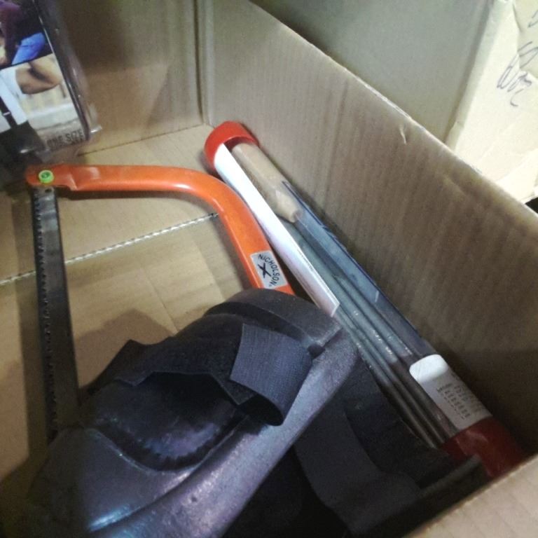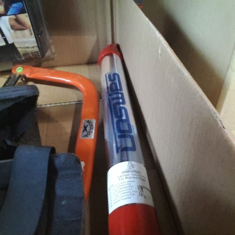 Box of bow saw, braided rope splicing kit, knee pads and more