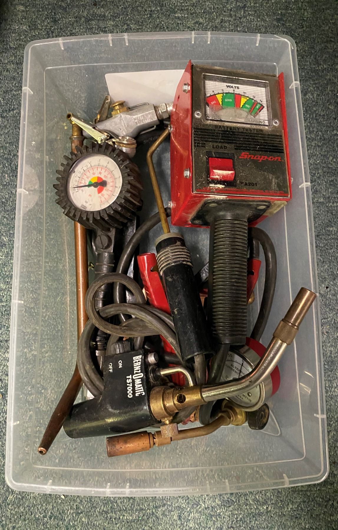 Box of mechanics accessories - Snap-On battery tester/ Bluepoint alternator current indicator/ Bernzomatic torch heads, air pressure gauge etc.