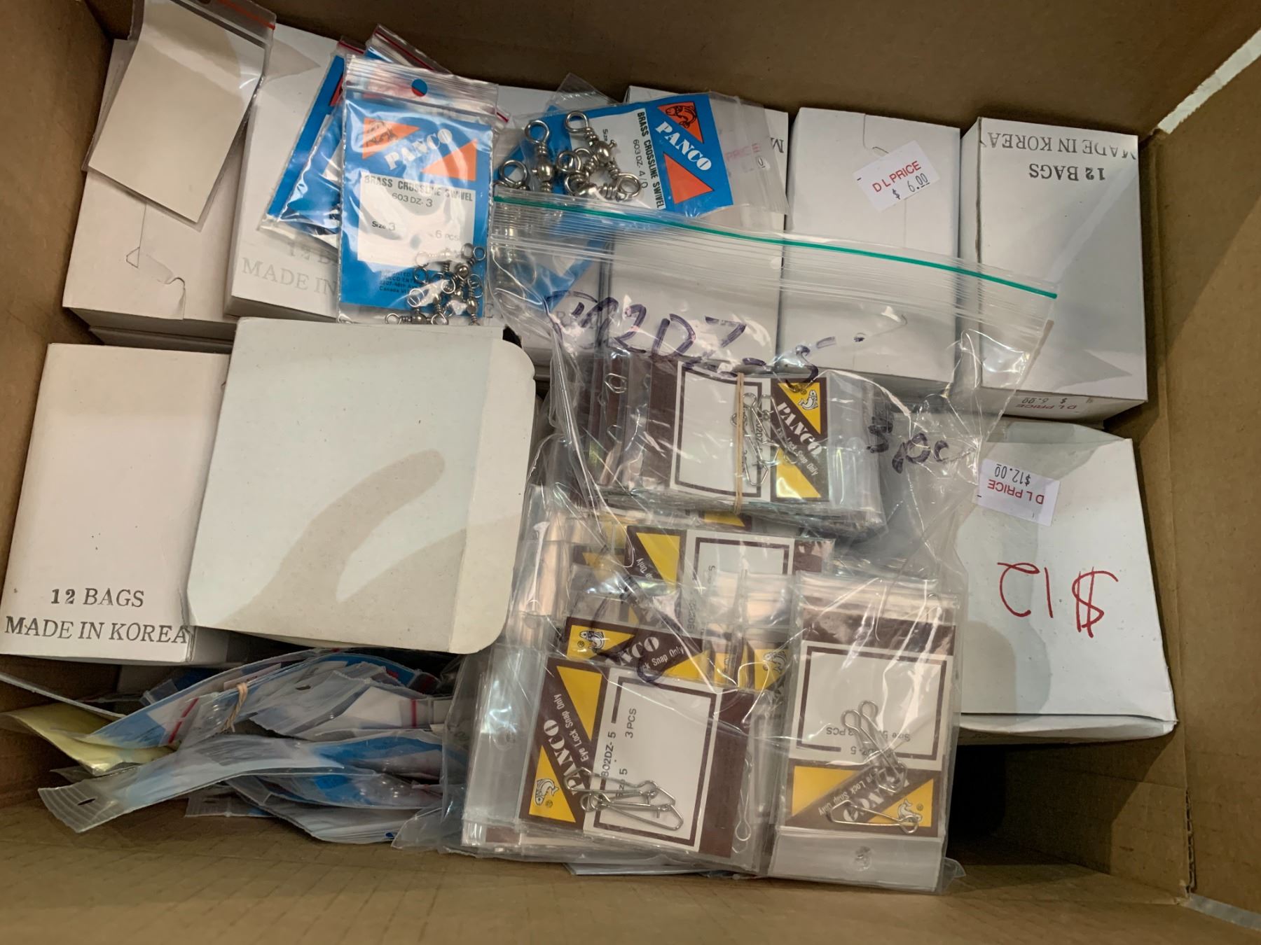 Box of misc hooks (sizes may vary) & Box of Brass crossline swivel