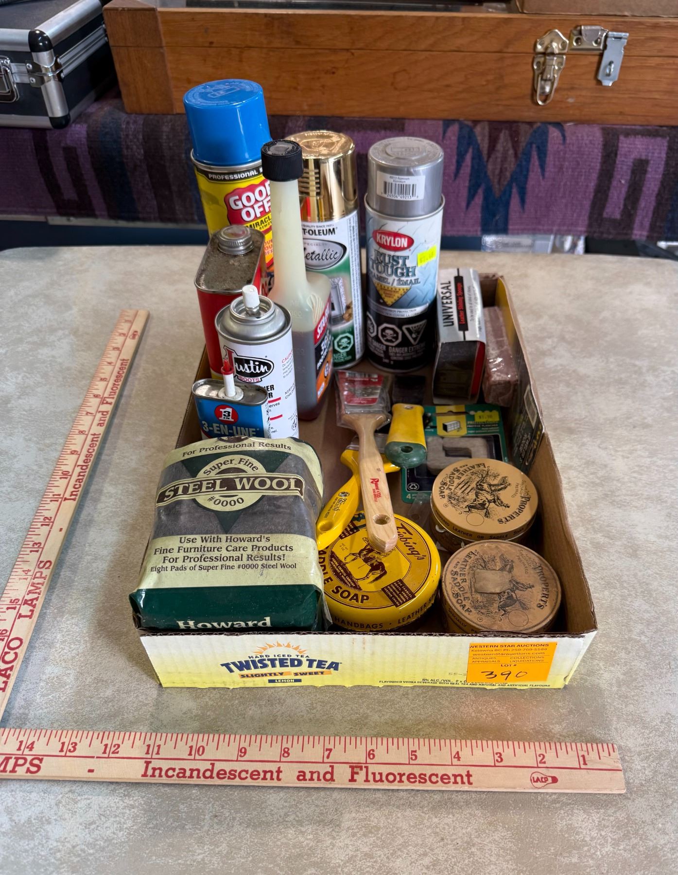 Box of misc. paint supplies & shop supplies: paint, scraper, oil, steel wool, saddle soap, etc.