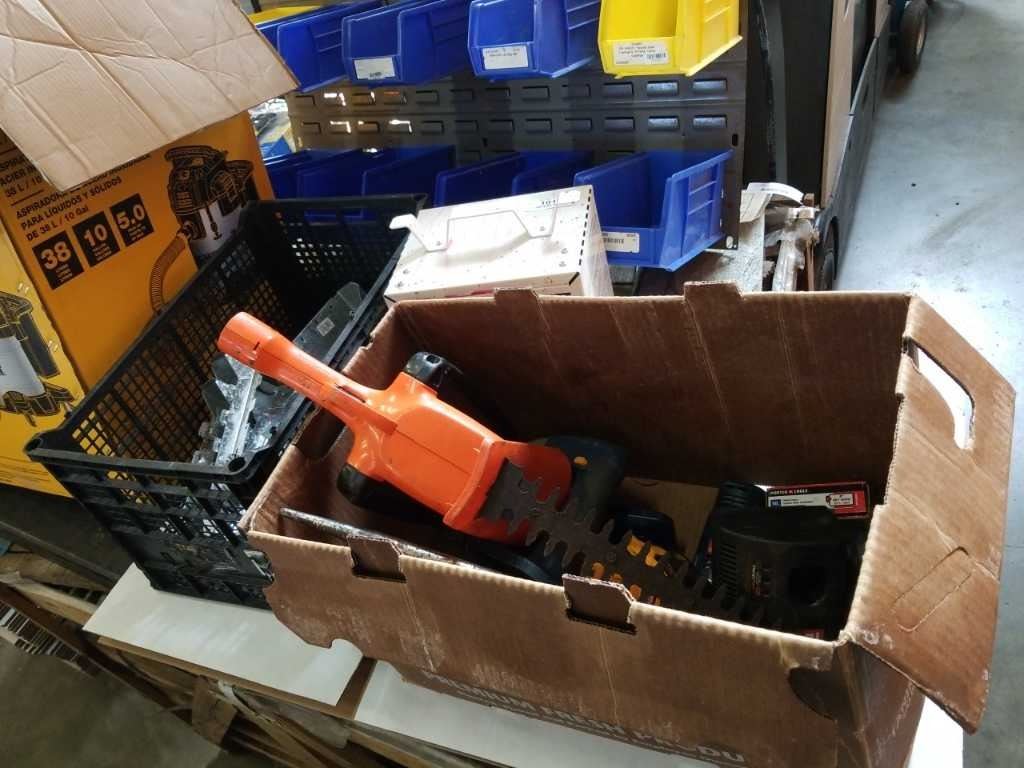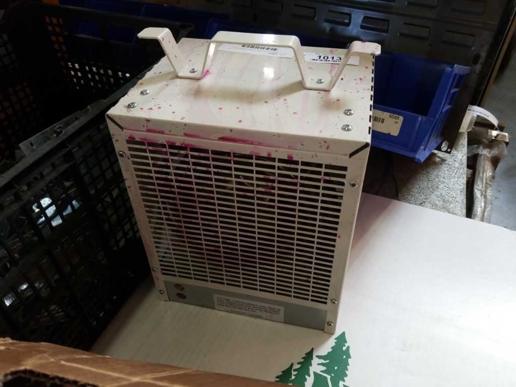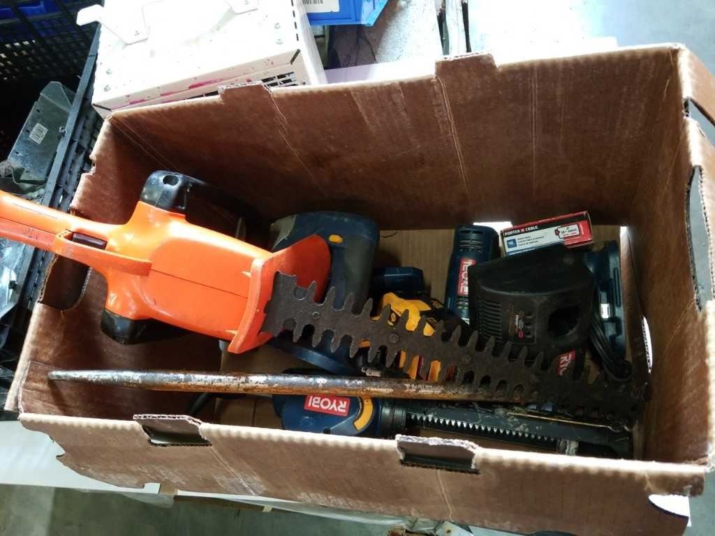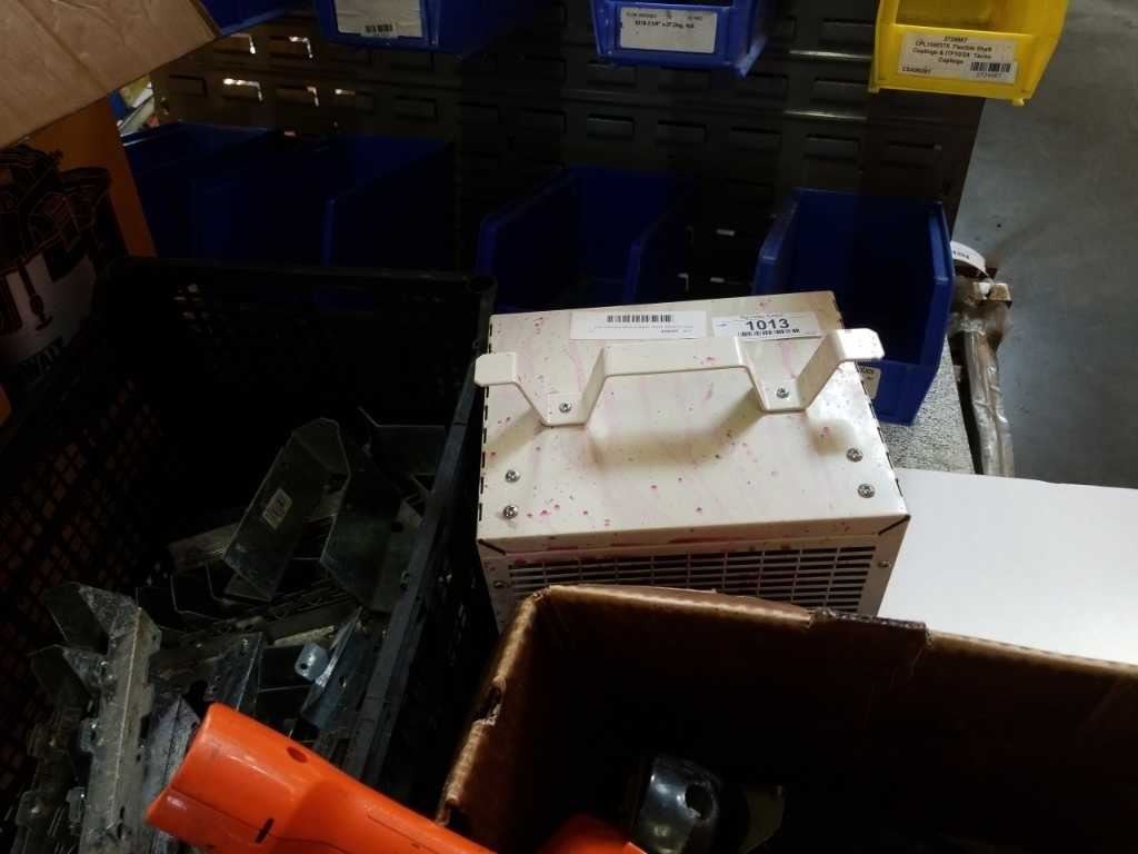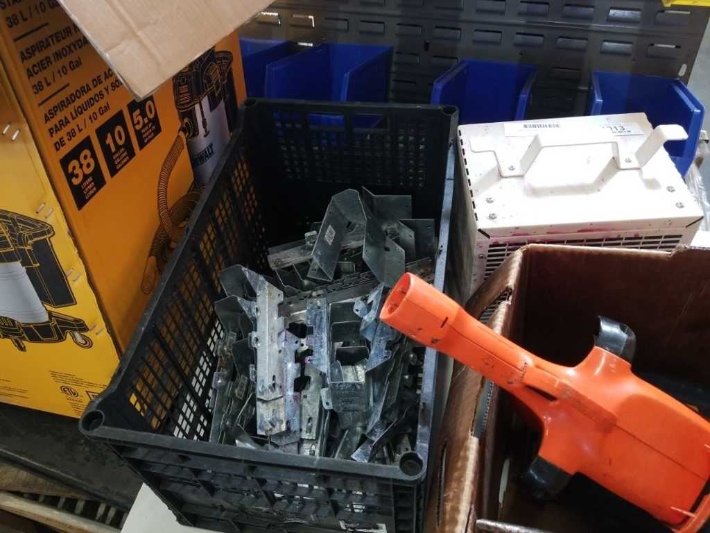 Box of power tools, crate of joist hangers and construction heater cut cord