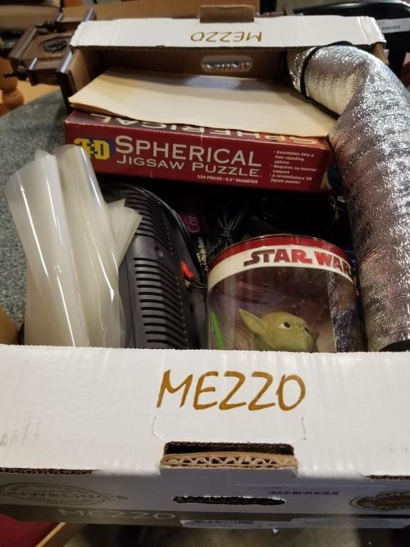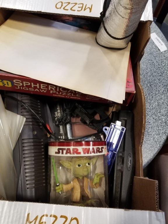 Box of star wars yoda, spherical puzzle and more