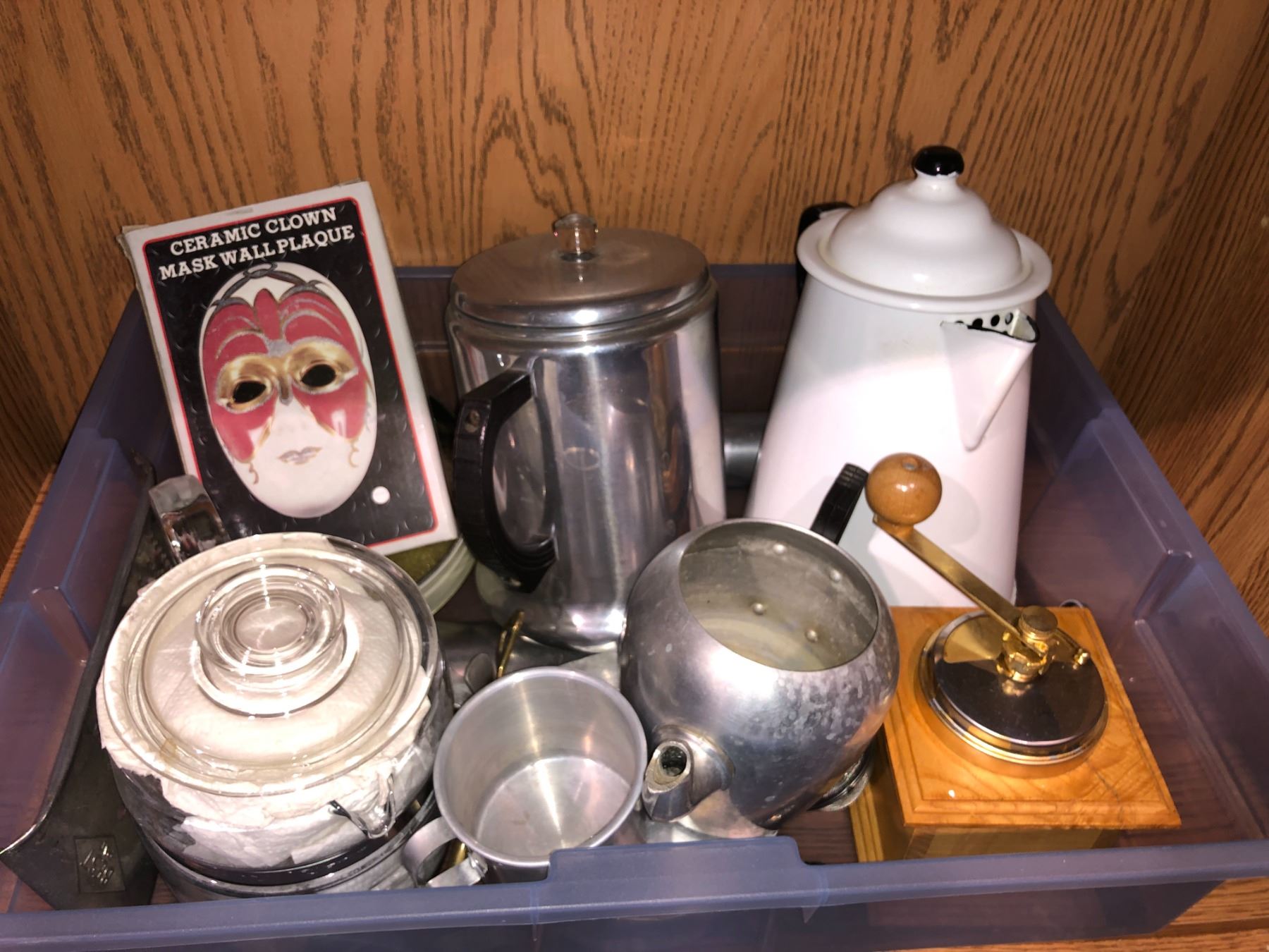 Box of vintage coffee pots/ kettles & coffee grinder