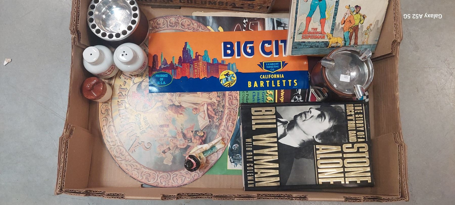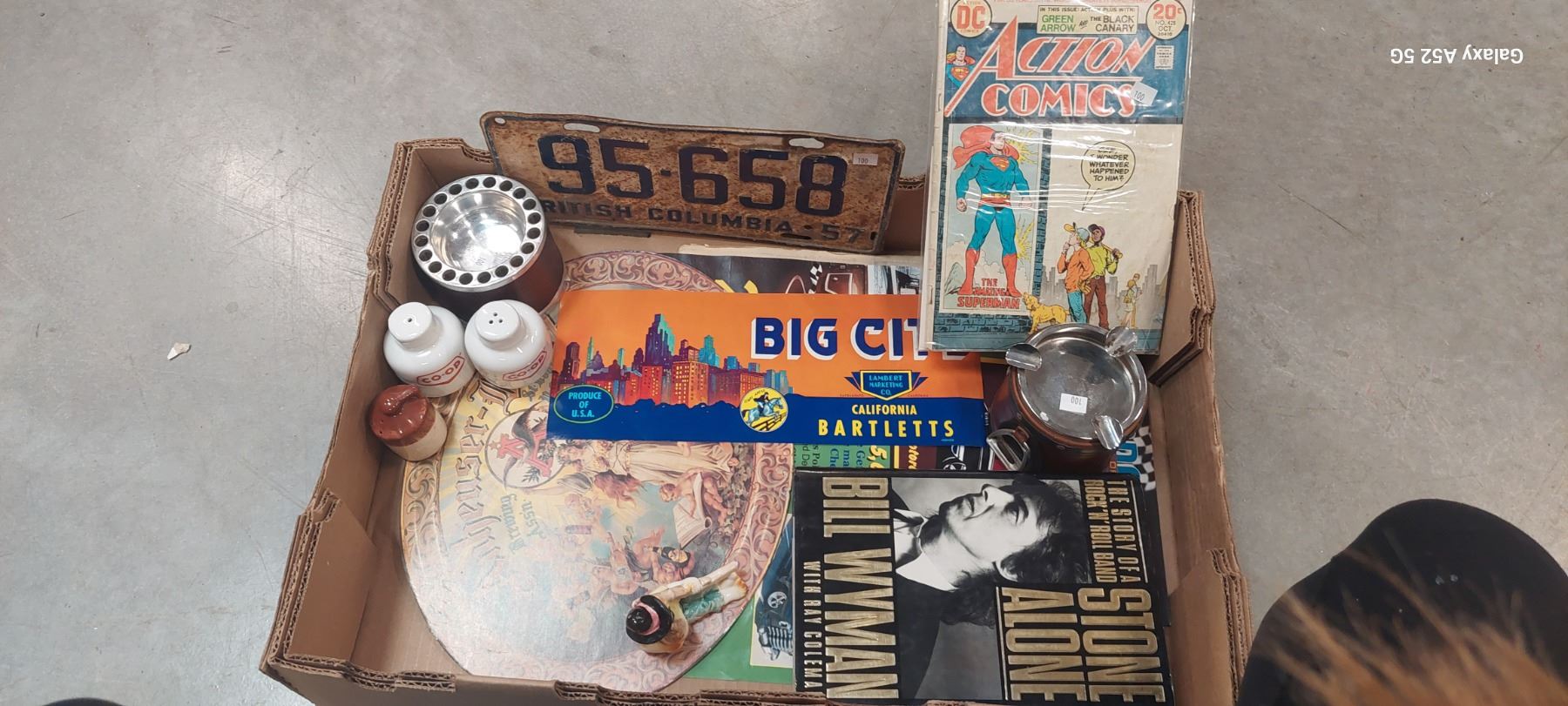 Box of vintage collectibles, 1957 license plate, Budweiser sign, 20 cent Superman comic, car show poster etc