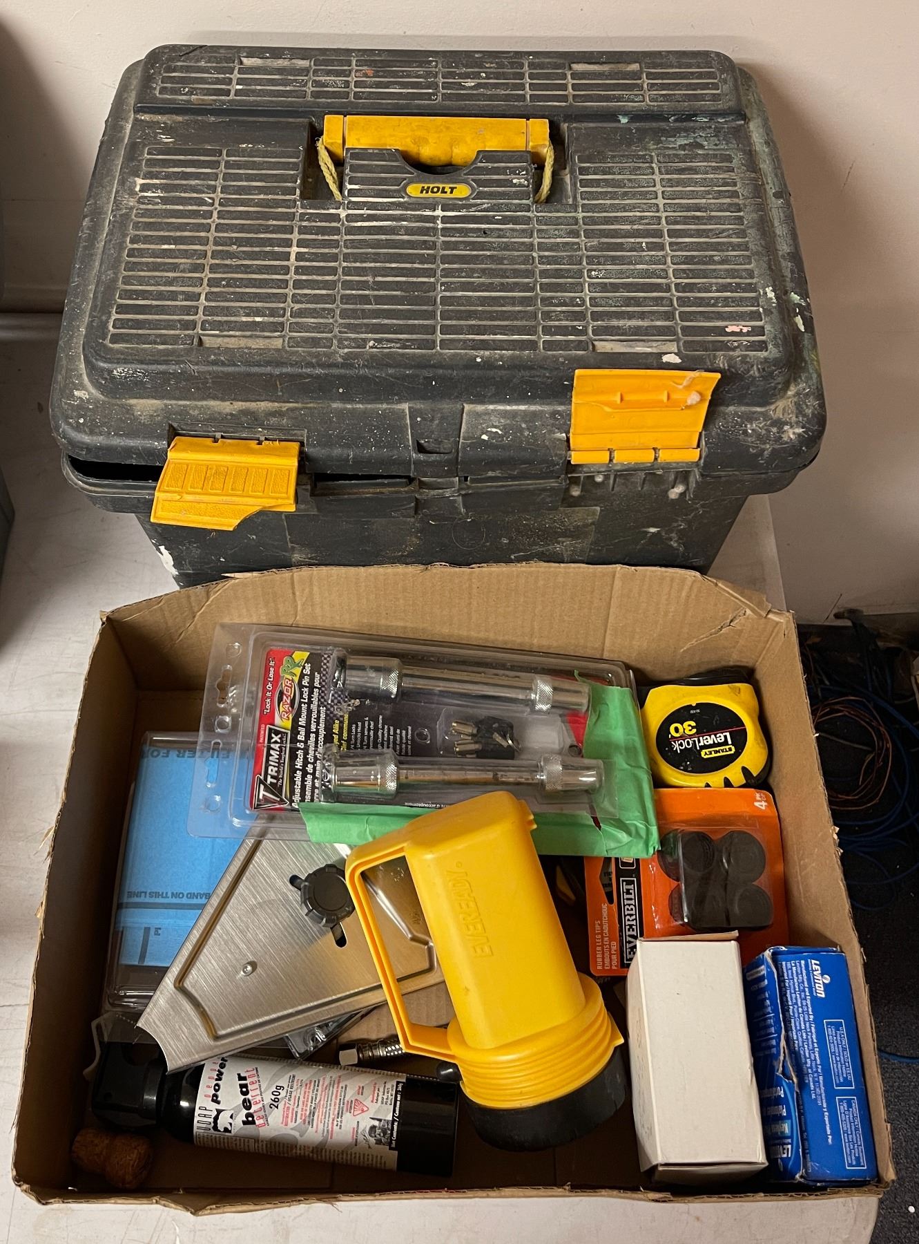 Box & toolbox full of assorted tools & misc - includes Skil drill driver / mastercut saw / studsensor / Tape measurers / Eveready flashlight etc