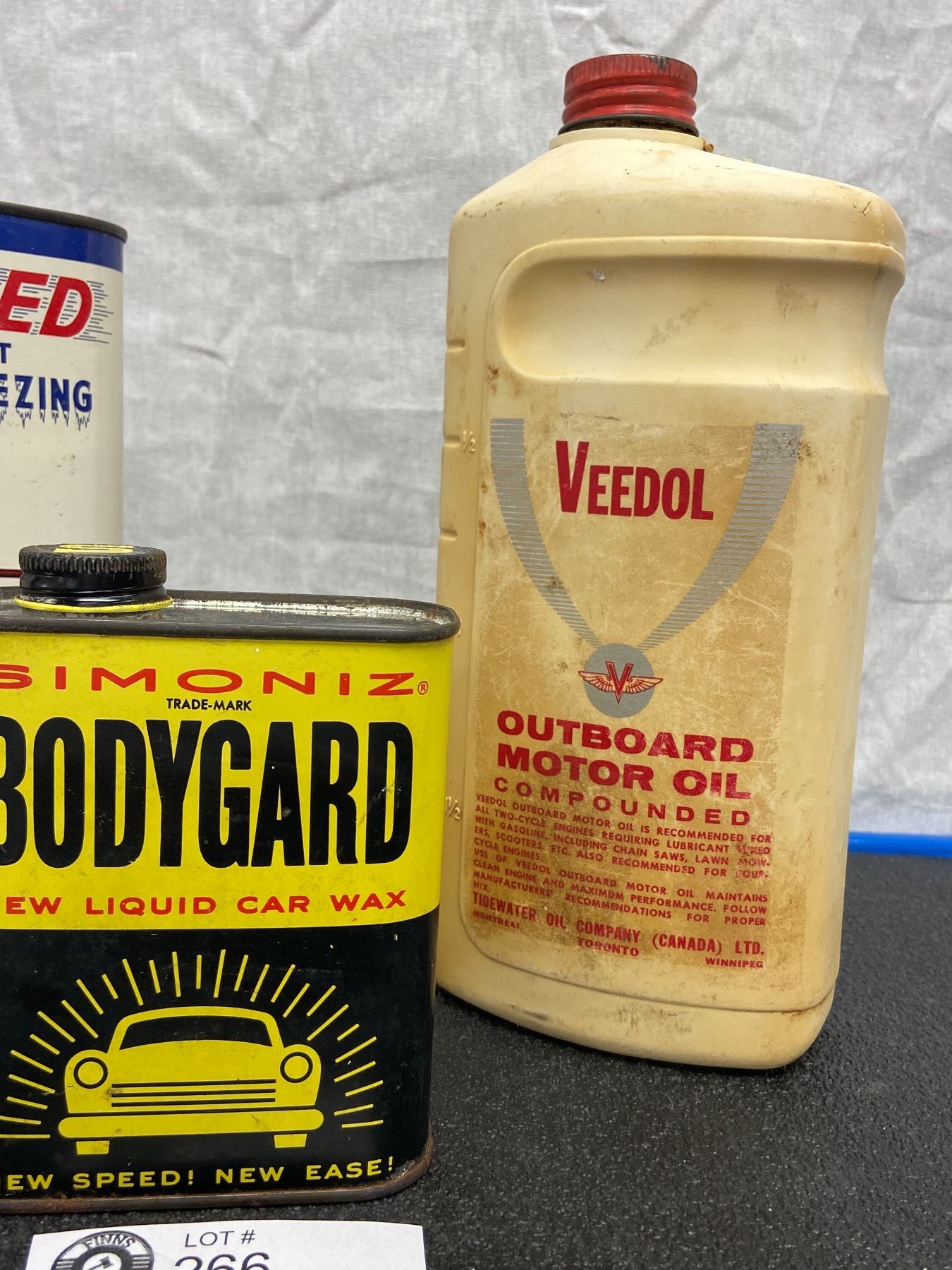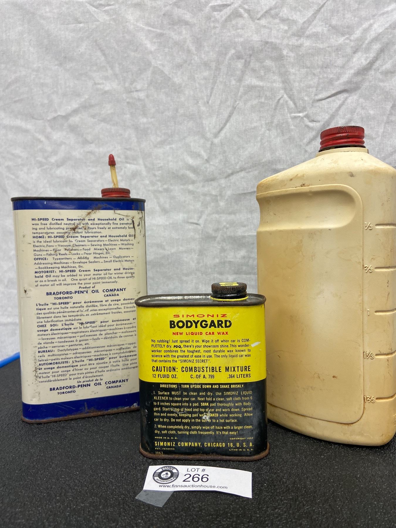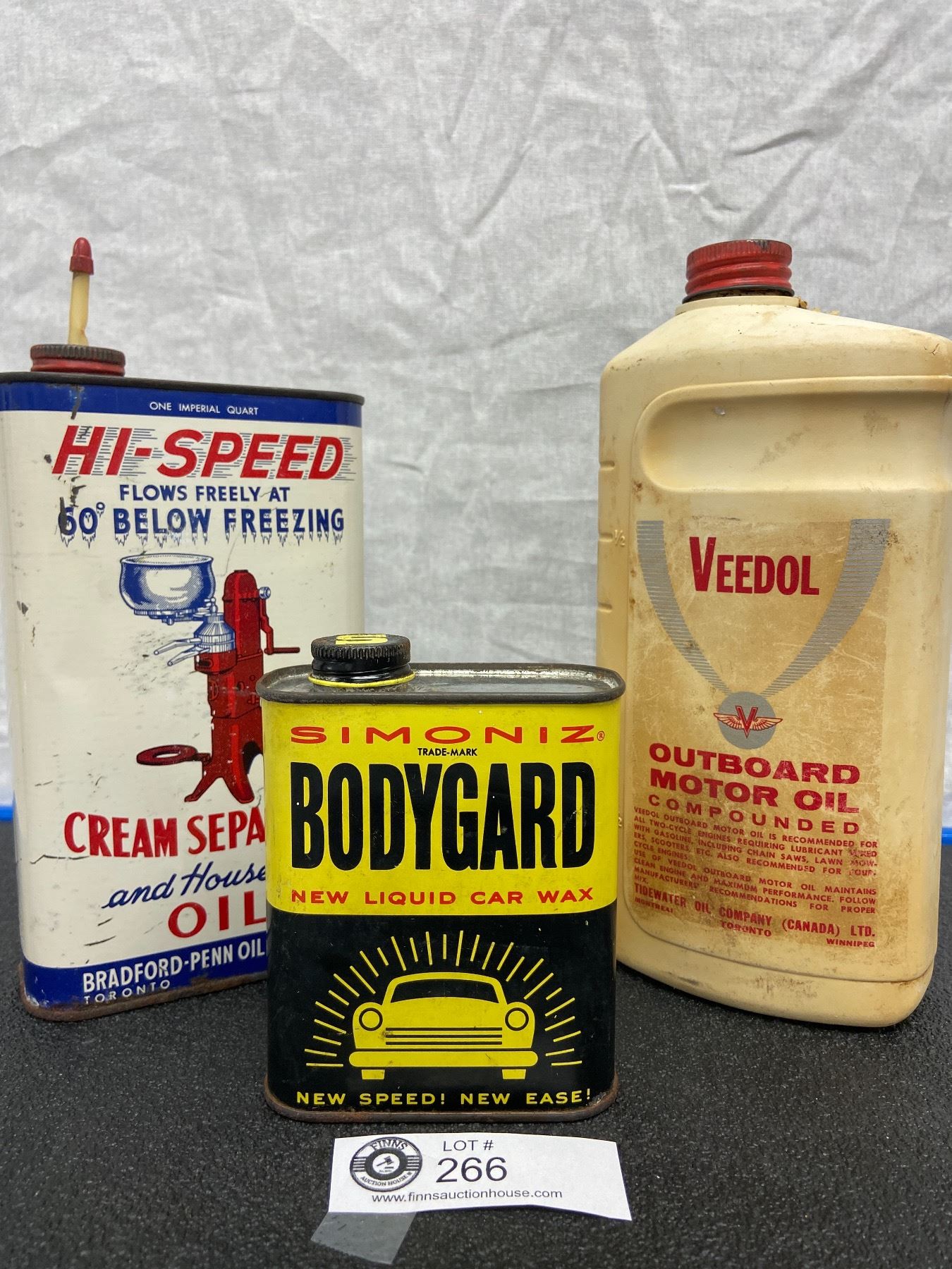 Bradford PennOil Cream Separator Oil Tin, Veedol Outboard Motor Oil Container and Simoniz Bodygard Vintage Tin