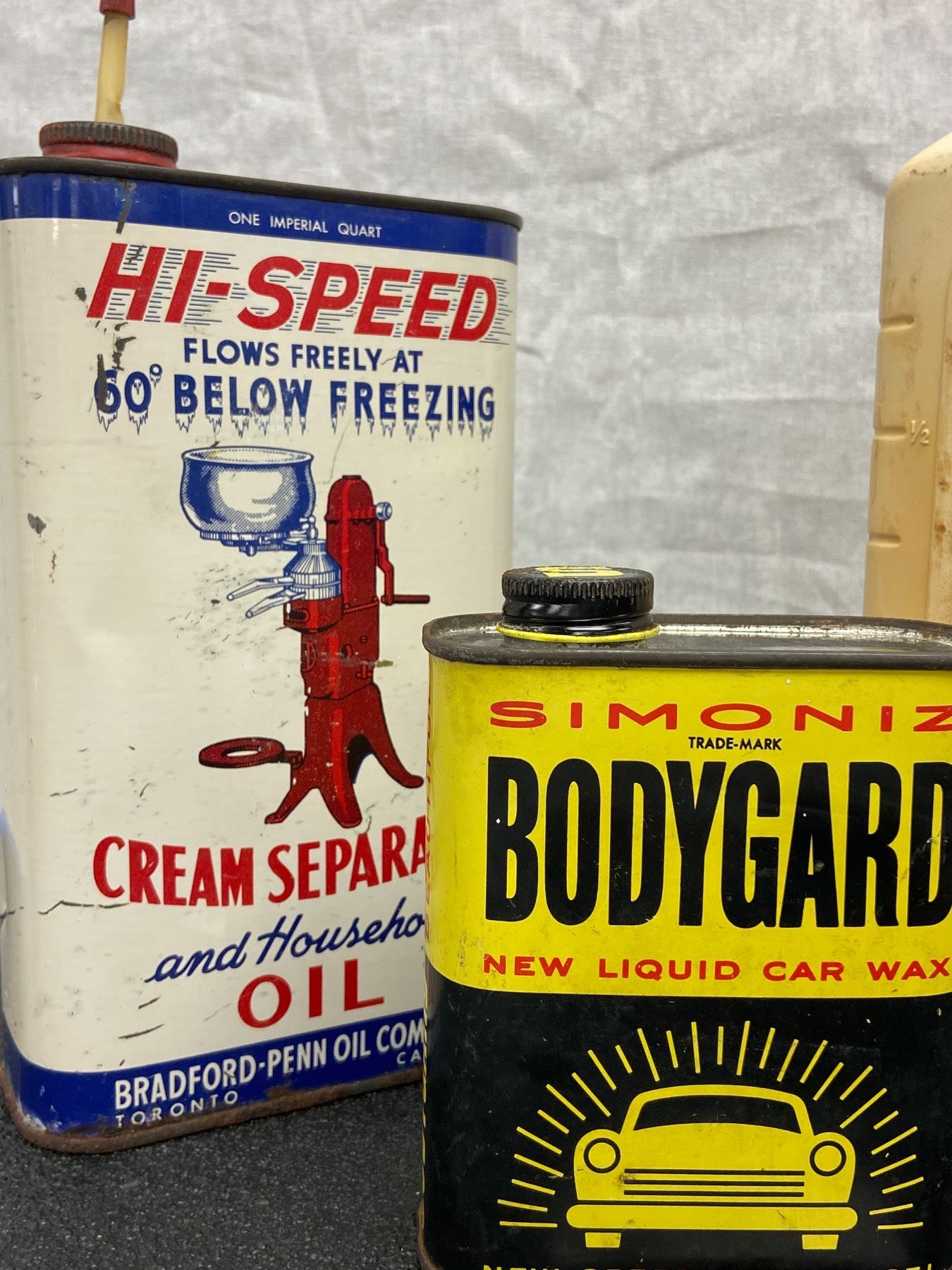 Bradford PennOil Cream Separator Oil Tin, Veedol Outboard Motor Oil Container and Simoniz Bodygard V