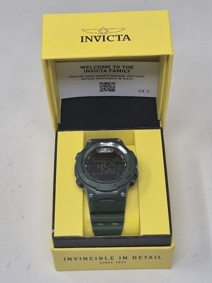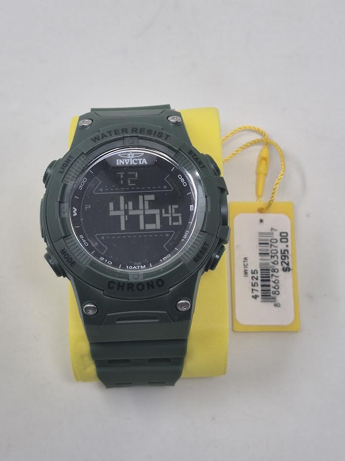 Green silicone band. Model 47525. Water Resistant/Date. Retail Tag $295 USD.