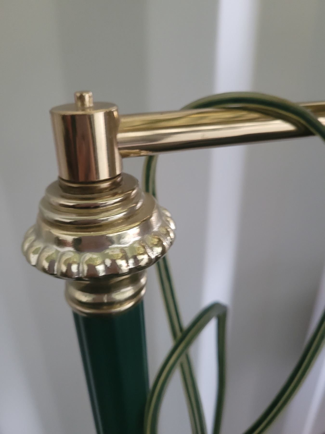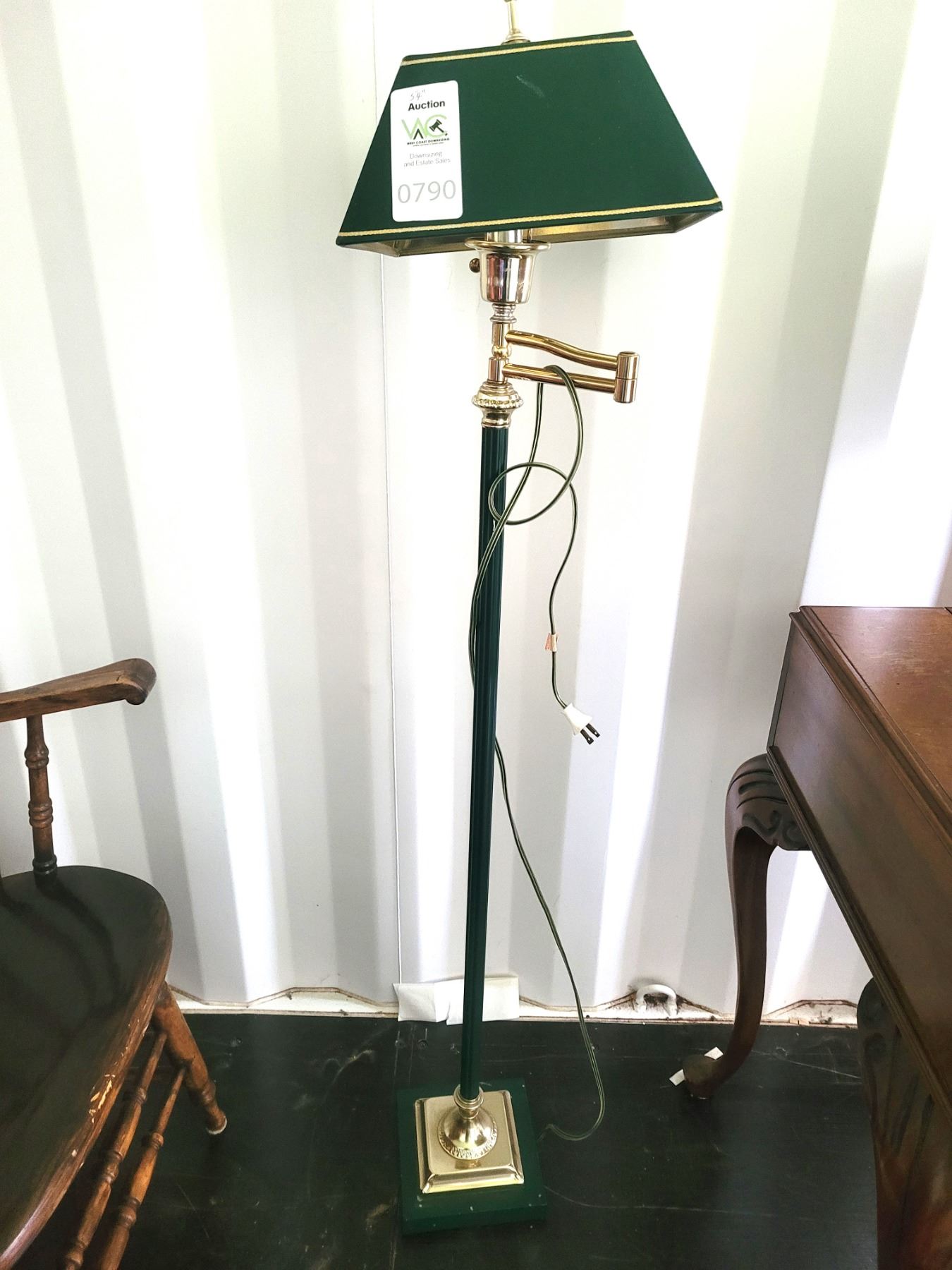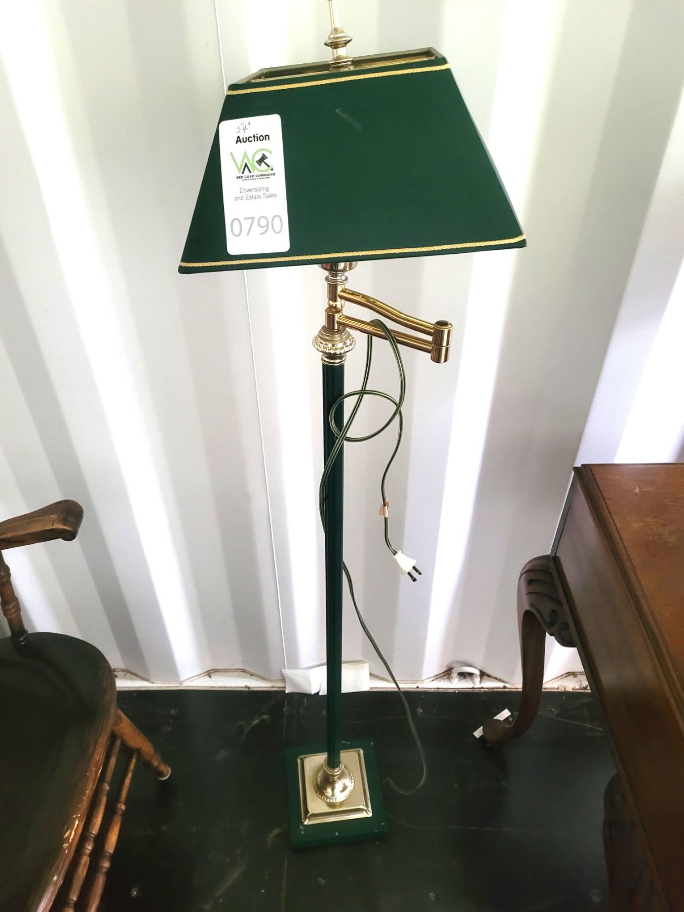 54" brass floor lamp with extendable arm, green and gold shade. Pickup at 11 am