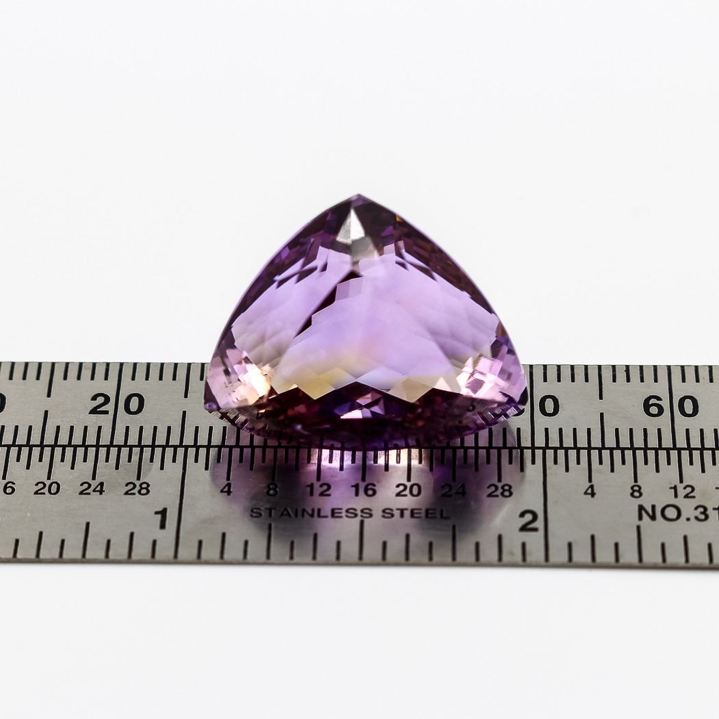 Breathtaking Rare Unheated Natural 35.30 Ct. Ametrine. This Large VVS1 Investment Grade Bolivian Ametrine Is Near Flawless Exhibiting A Spectacular Blend Of Sparkling Purple Into An Easy Gold Fade.Fancy Trillion Cut Measuring 18.5 x 23 x 15.4 mm.It Is Very Hard To Find As Large and Nice Of Quality Natural Un-Treated Ametrine As This One. This Is A Must See. The Pictures Can Not Even Unveil The True Beauty and Sparkle Of This Stone. Magnificant.