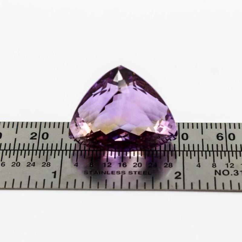 Breathtaking Rare Unheated Natural 35.30 Ct. Ametrine. This Large VVS1 Investment Grade Bolivian Ametrine Is Near Flawless Exhibiting A Spectacular Blend Of Sparkling Purple Into An Easy Gold Fade.Fancy Trillion Cut Measuring 18.5 x 23 x 15.4 mm.It Is Very Hard To Find As Large and Nice Of Quality Natural Un-Treated Ametrine As This One. This Is A Must See. The Pictures Can Not Even Unveil The True Beauty and Sparkle Of This Stone. Magnificant.
