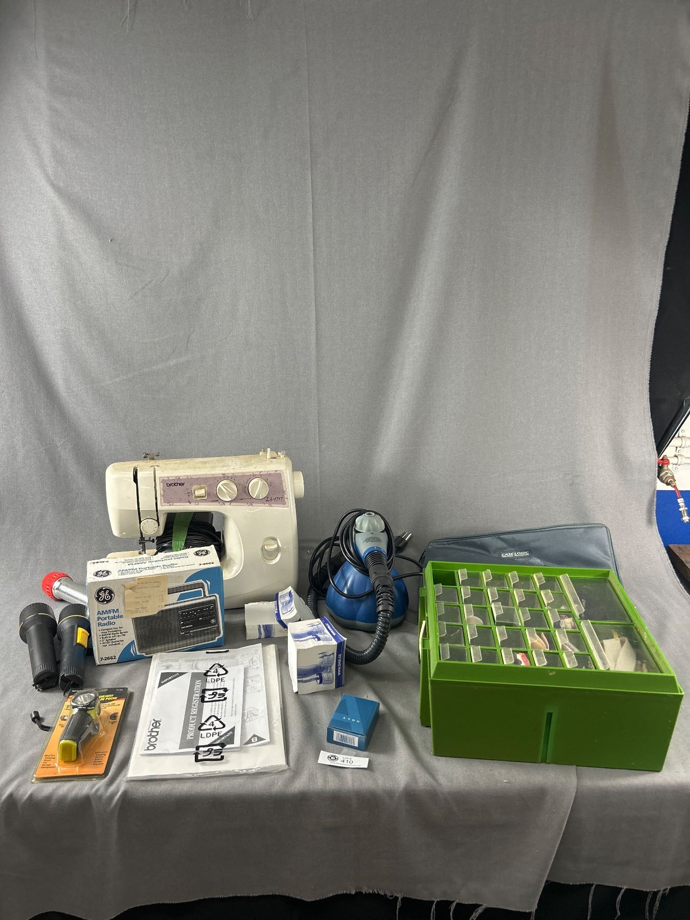 Brother Sewing Machine (As Is), Flashlights, Portable GE Radio, Cassette Holder w/ Cassettes & More