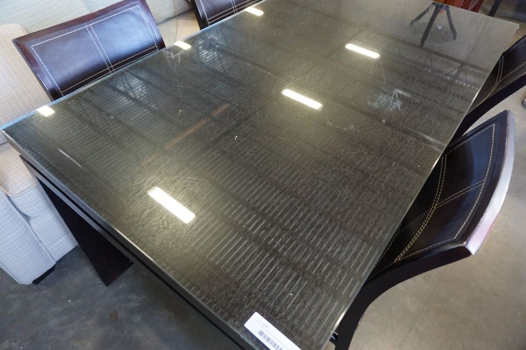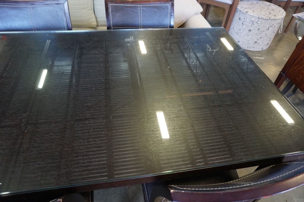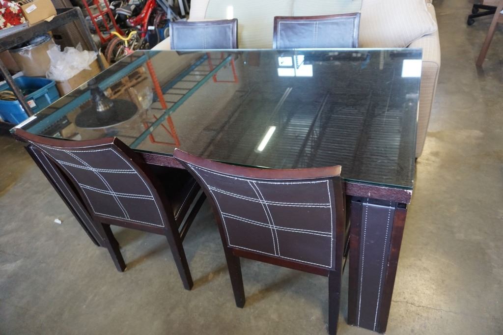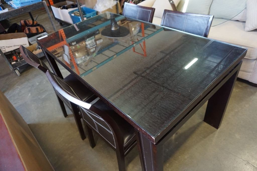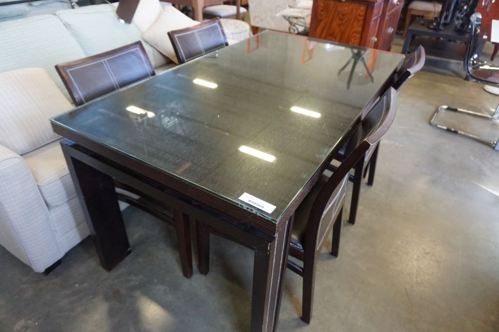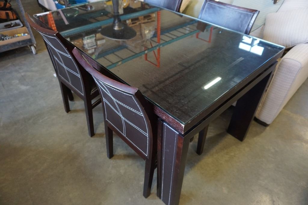 Brown dining table with leather wrap legs and 4 stitched chairs