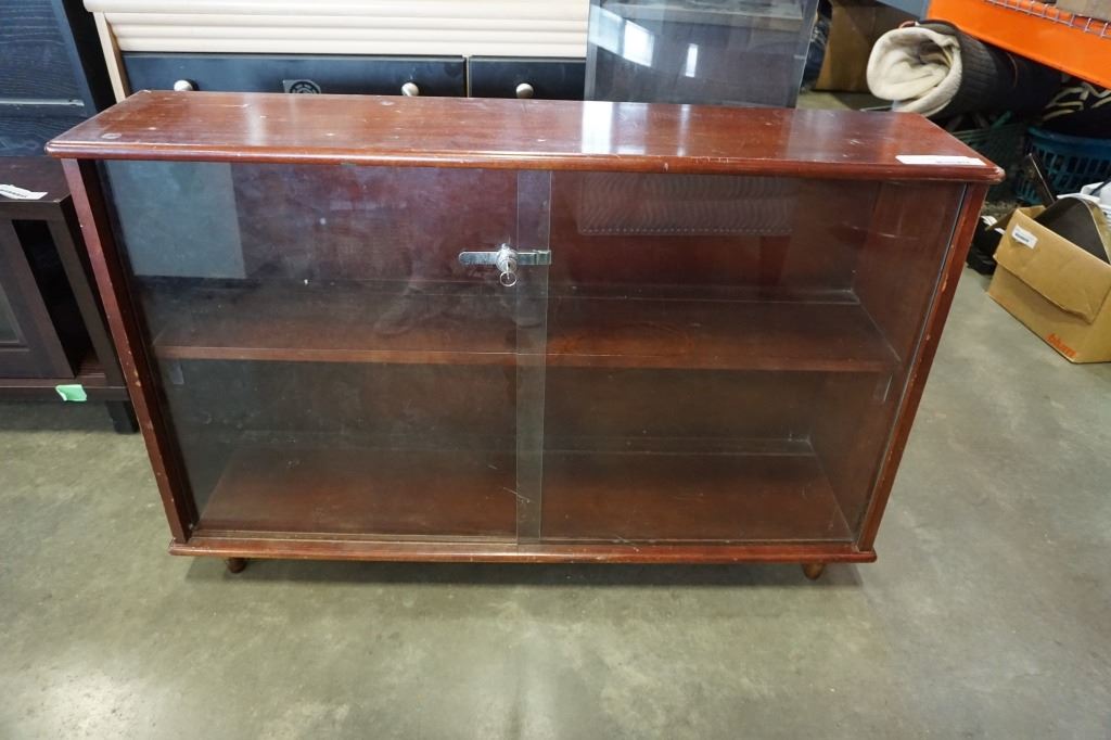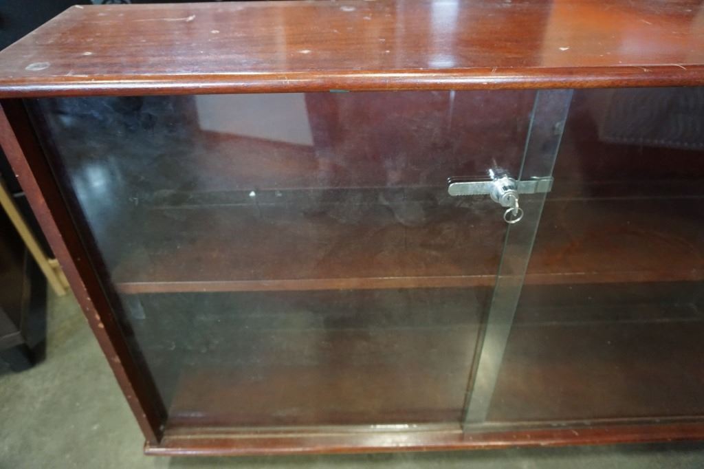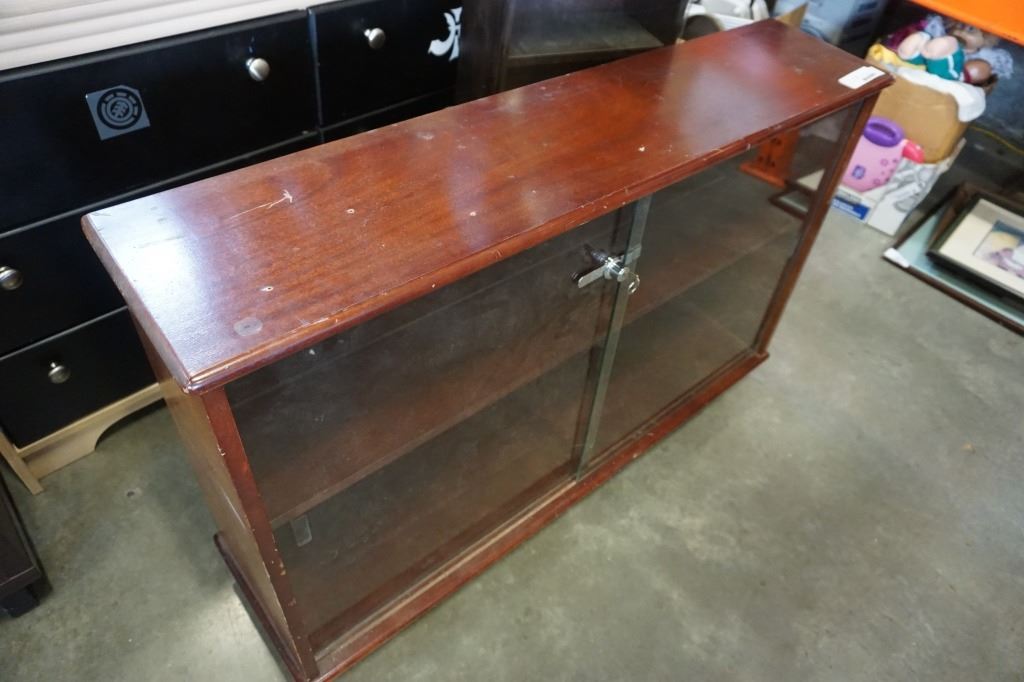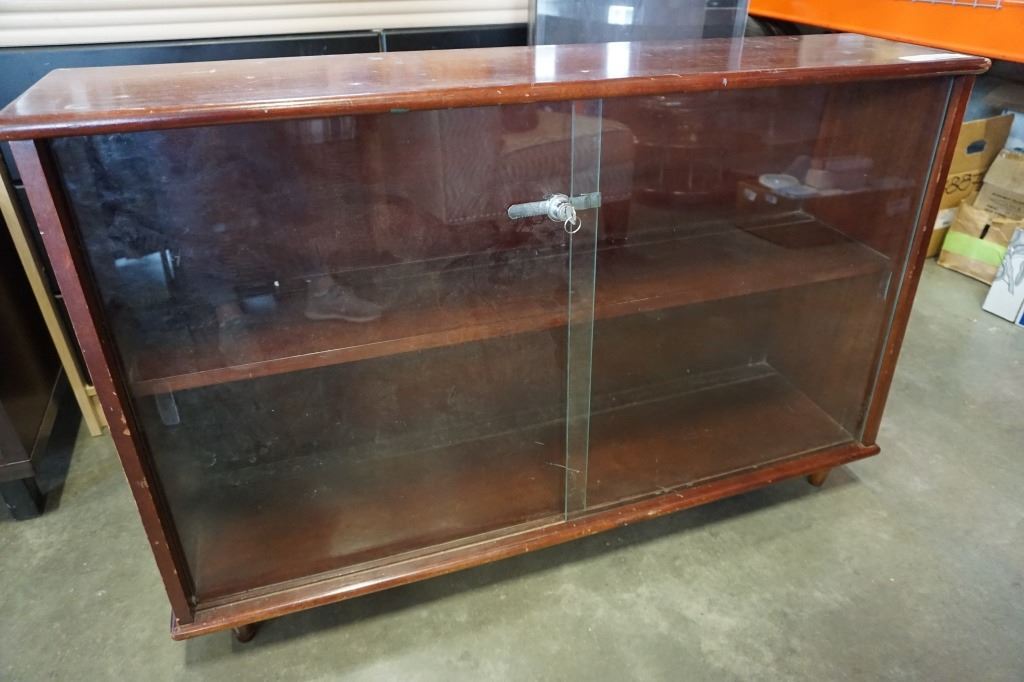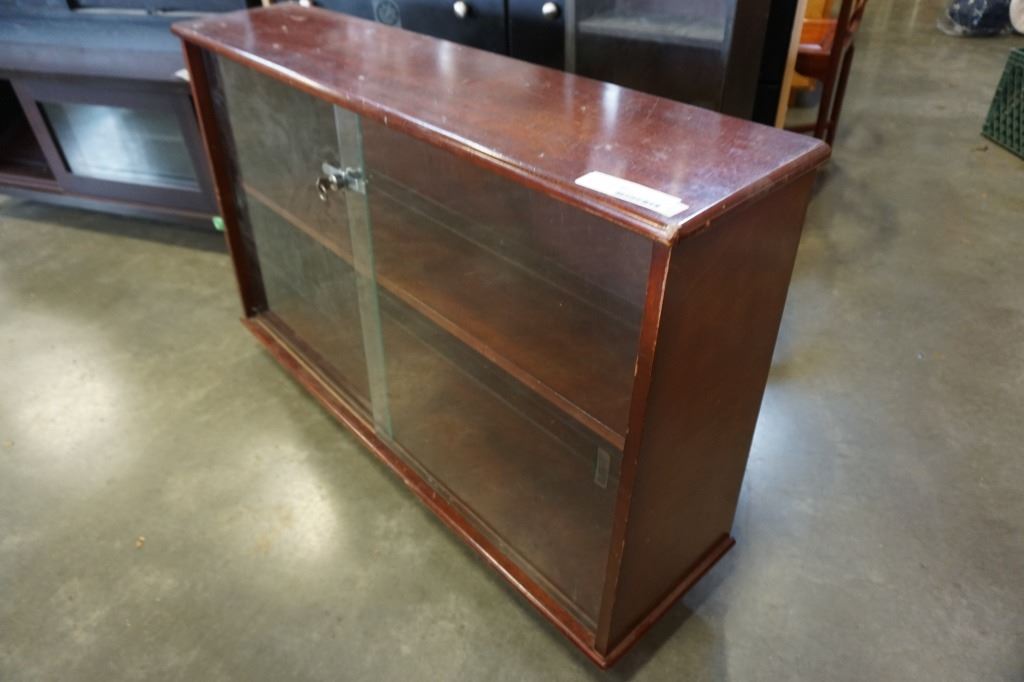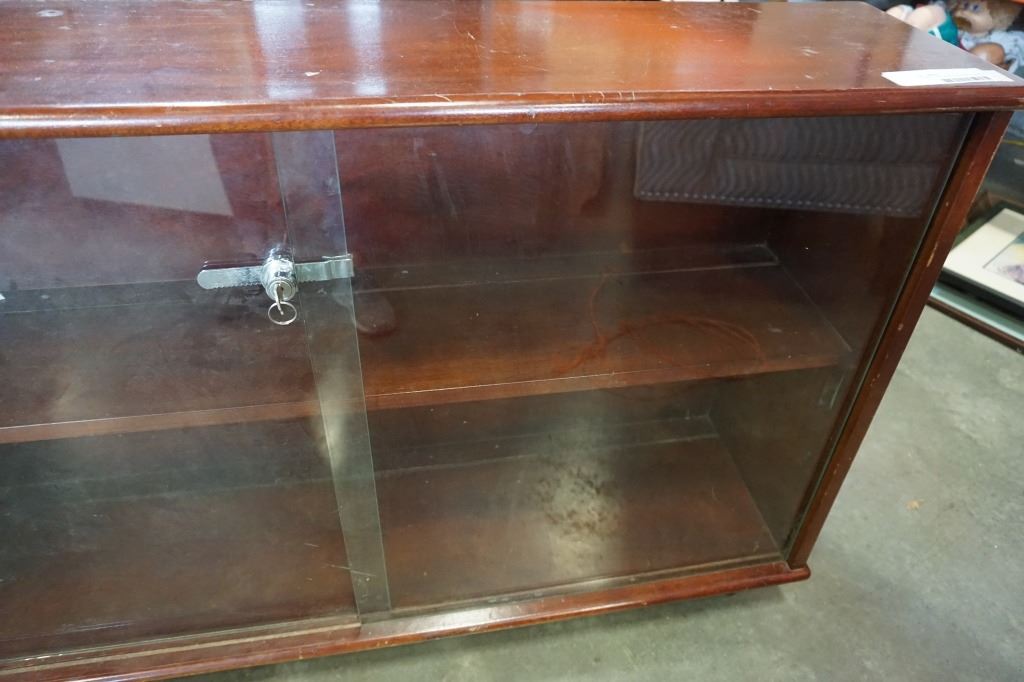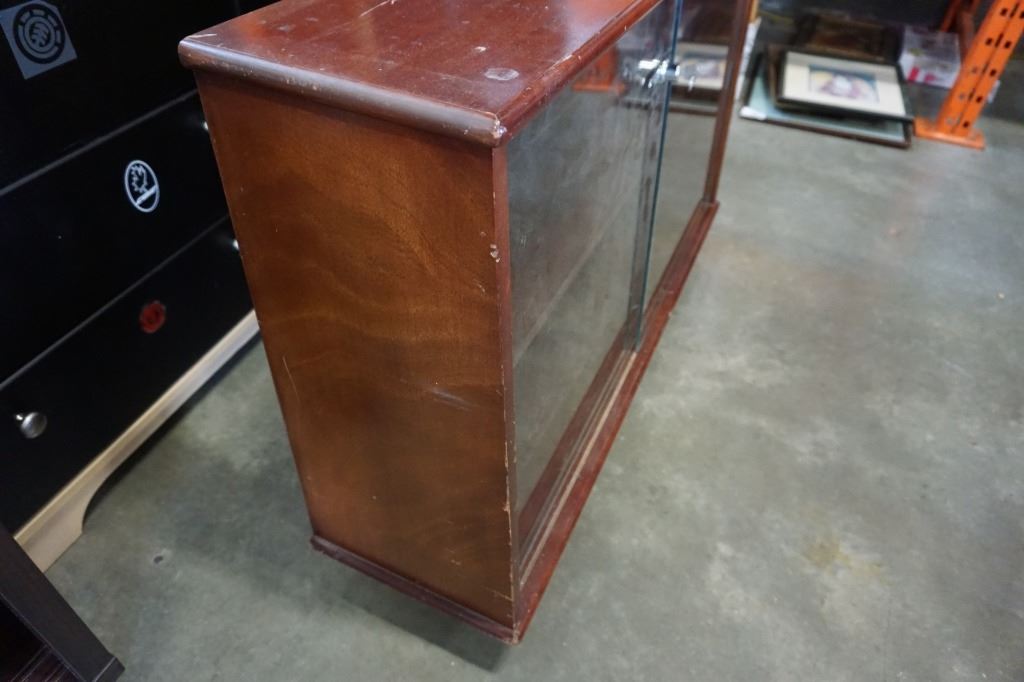 Brown wooden glass door display case with door lock and key 44"L x 28"H X 12"D