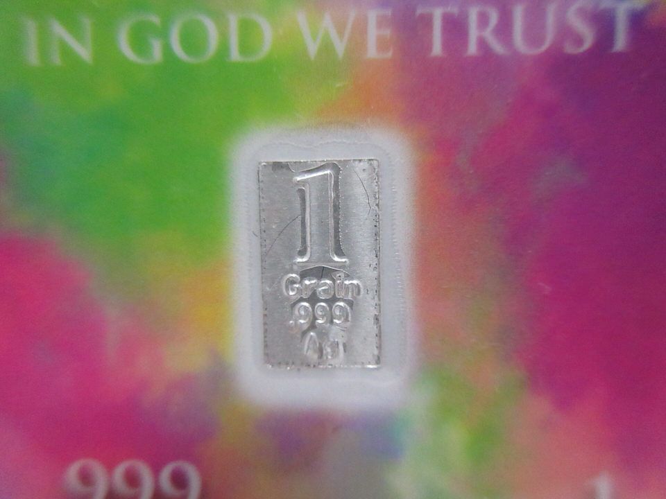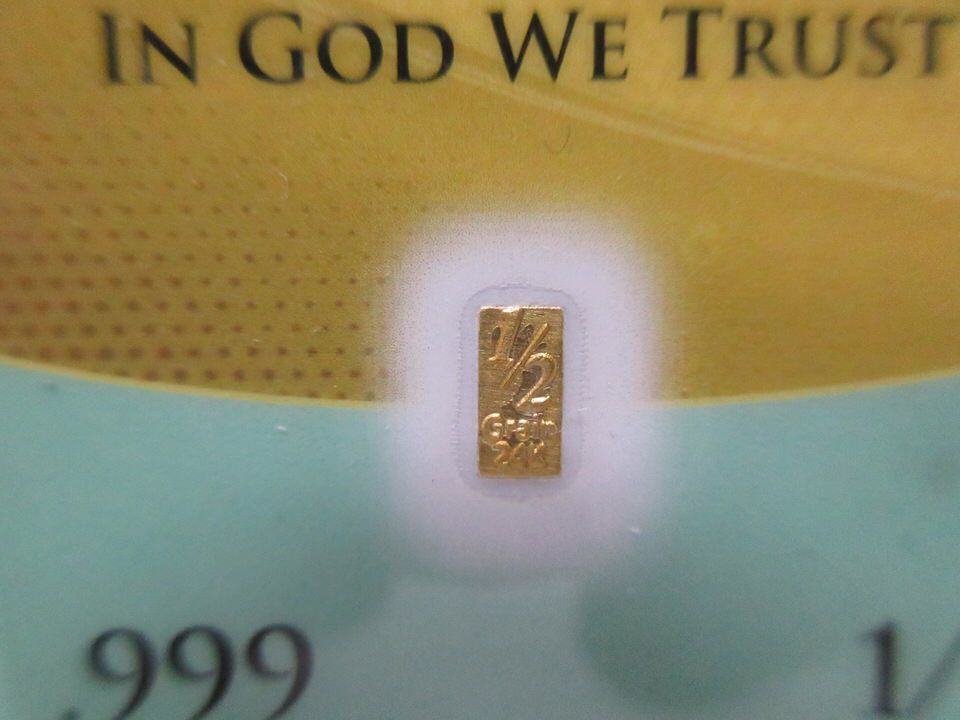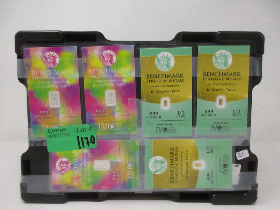Benchmark gold & silver bars are mint sealed on certified cards. Total gold weight is 1 1/2 grains. Total silver weight is 3 grains. Black Bullion box measures 8" x 10" x 5" deep.