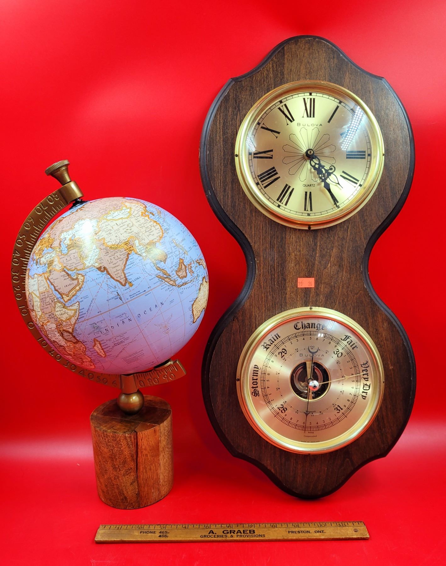 Bulova Clock/Barometer & Globe w/ Wooden Stand
