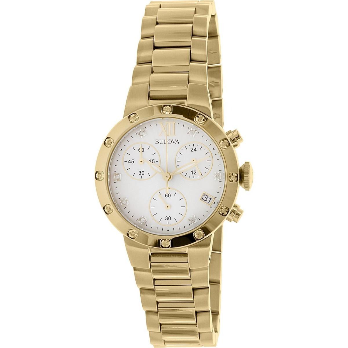 Bulova Ladies Diamond Watch....Item Shape-round;Dial window material;Display Type analog ;Clasp Type deployment-clasp-with-push-button;Case material stainless-steel;Case diameter 30 millimeters;Case Thickness 10 millimeters;Band length womens-standard;Band width 19 millimeters;Band Colour Gold;Dial colour Mother-Of-Pearl;Calendar ;Date;Special features luminous, chronograph, measures-seconds;