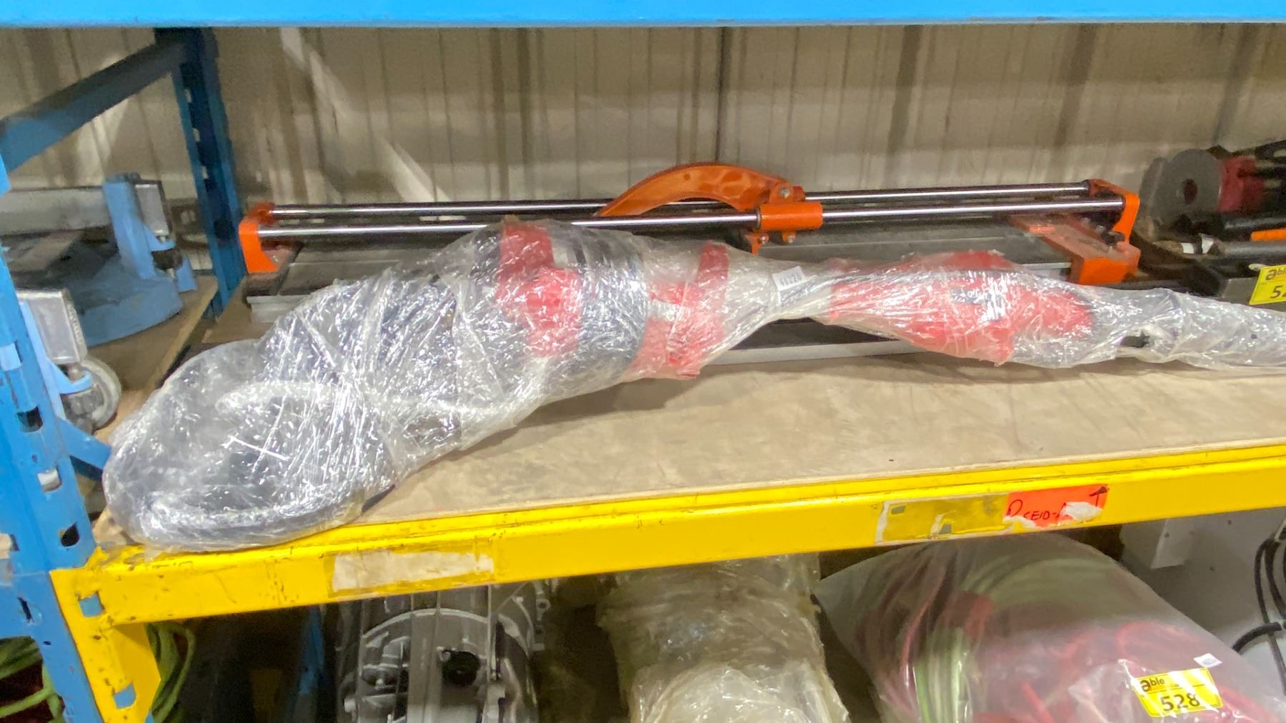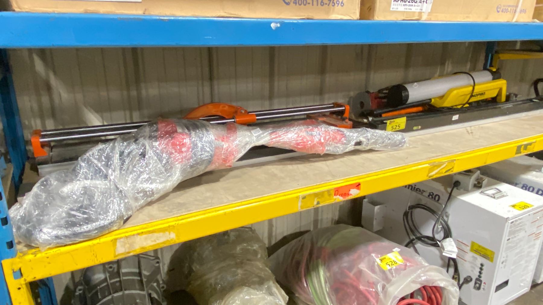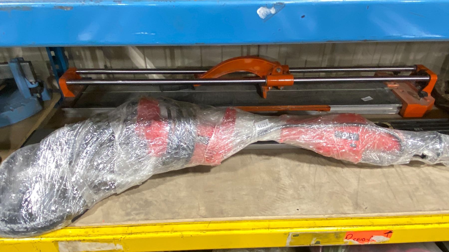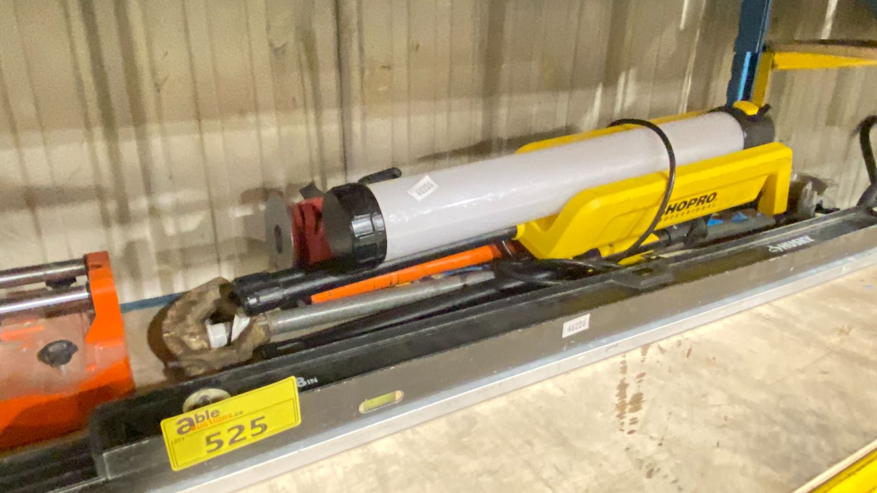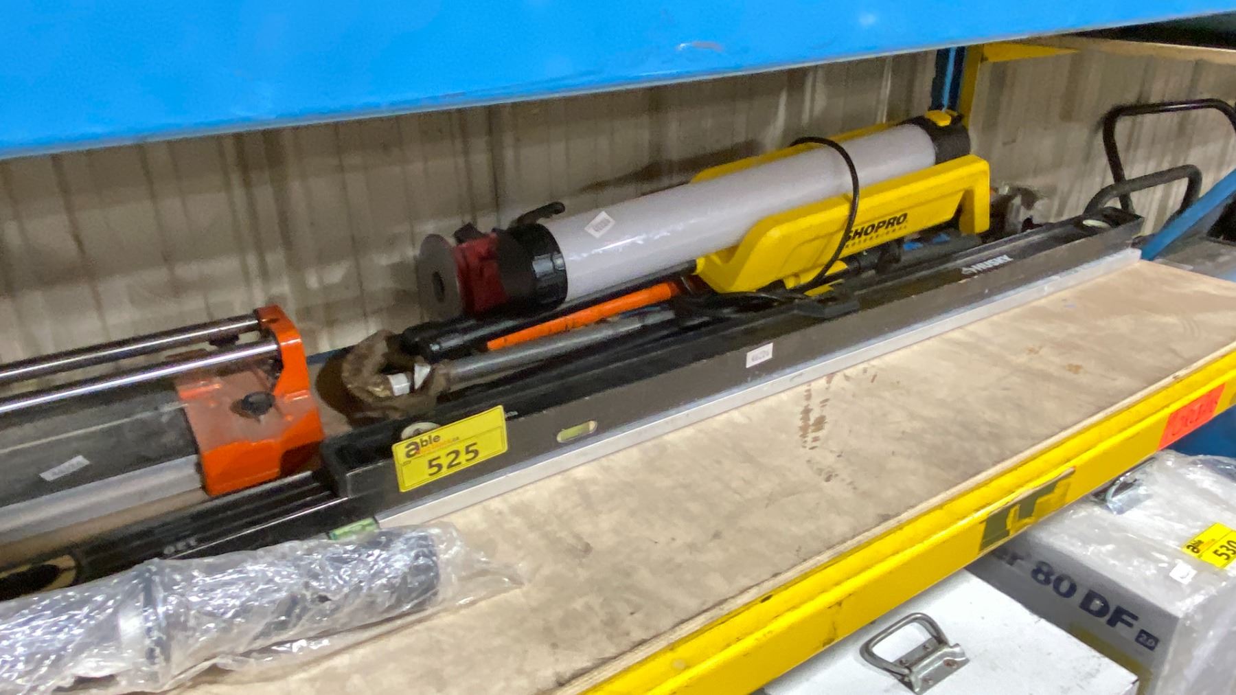 C.M. ELECTRIC HAND HELD DRYWALL SCREW GUN, ORANGE HAND OPERATED TILE CUTTER, SHOPPRO PROFESSIONAL TUBE WORK LIGHT, SURVEYORS TRIPOD, 3 INDUSTRIAL LEVELS, & 3 HAND OPERATED PIPE BENDERS